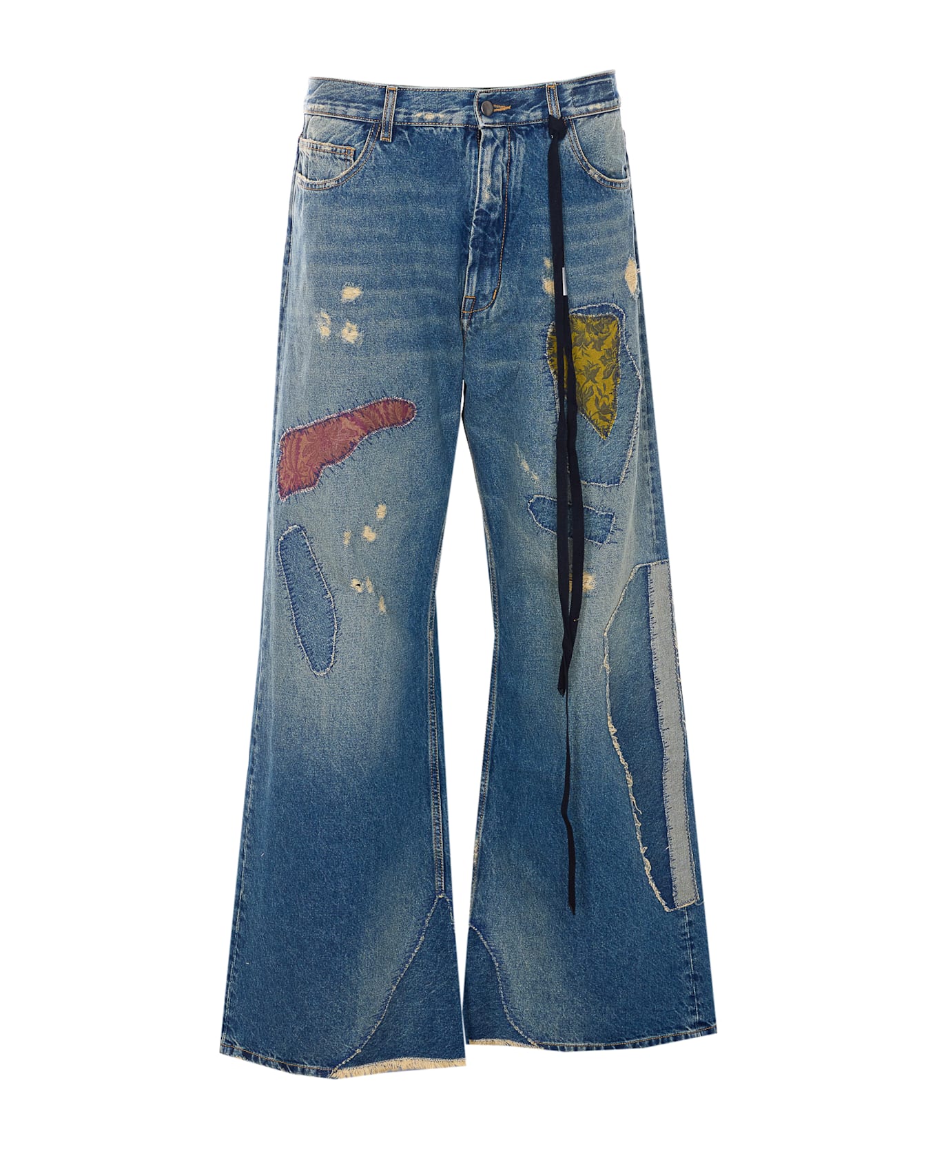 Ann Demeleumeester blue denim pants, zip and button closure, five pockets, lace detail, relaxed and flared model, modest model, patcwork Composition: 100% Cotton