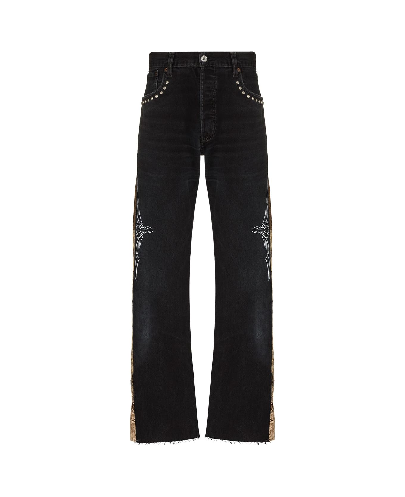 Black/brown/beige cotton Vintage All American panelled jeans from Children Of The Discordance featuring panelled design, straight leg, mid-rise, front button and zip fastening, belt loops, signature five-point crown and stud embellishment.