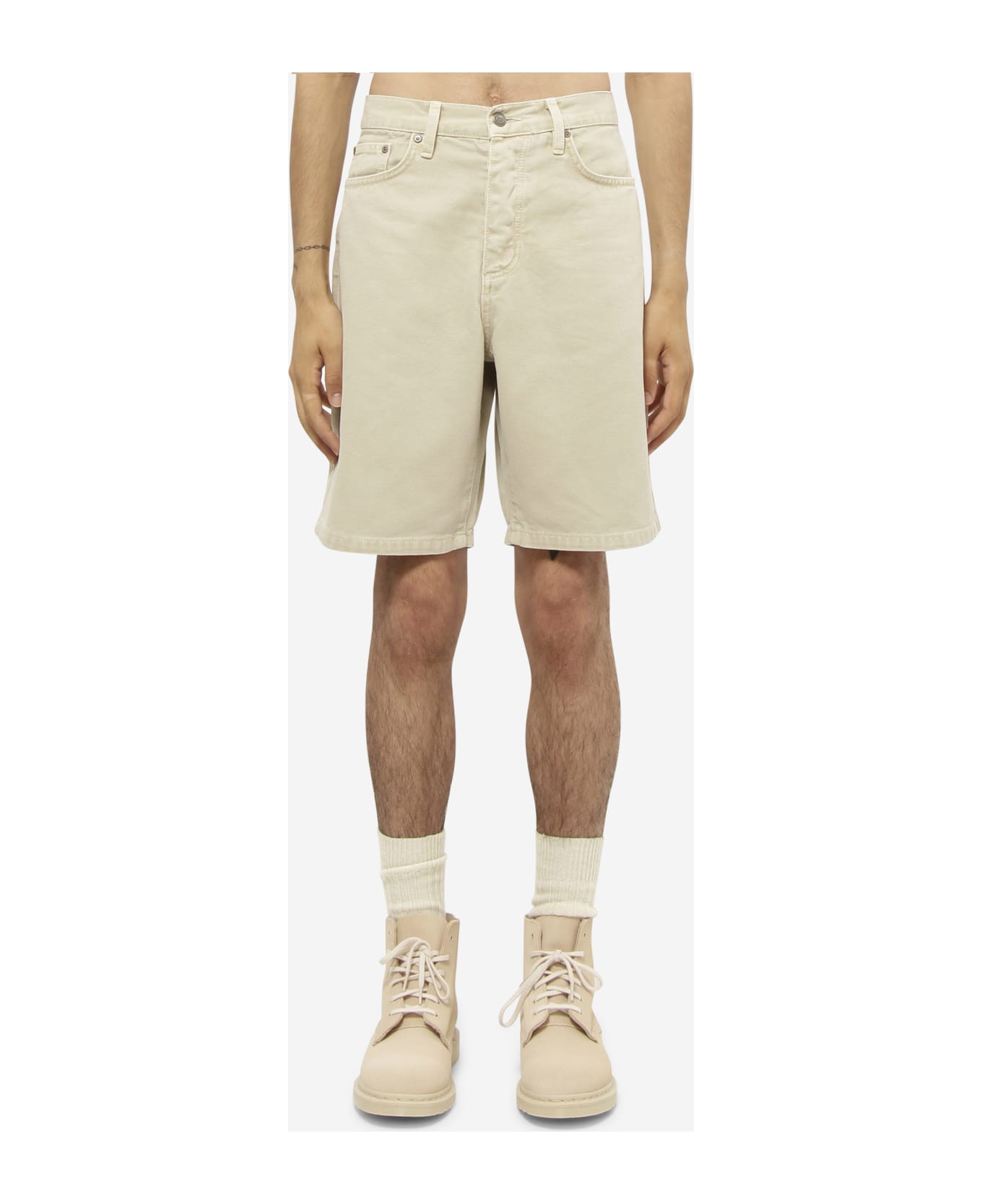 BIG OL Shorts in beige cotton, 100% cotton, pants loops , front pockets, back pockets, closing with zip e buttons, model high is 185 cm, model is wearing a size 30