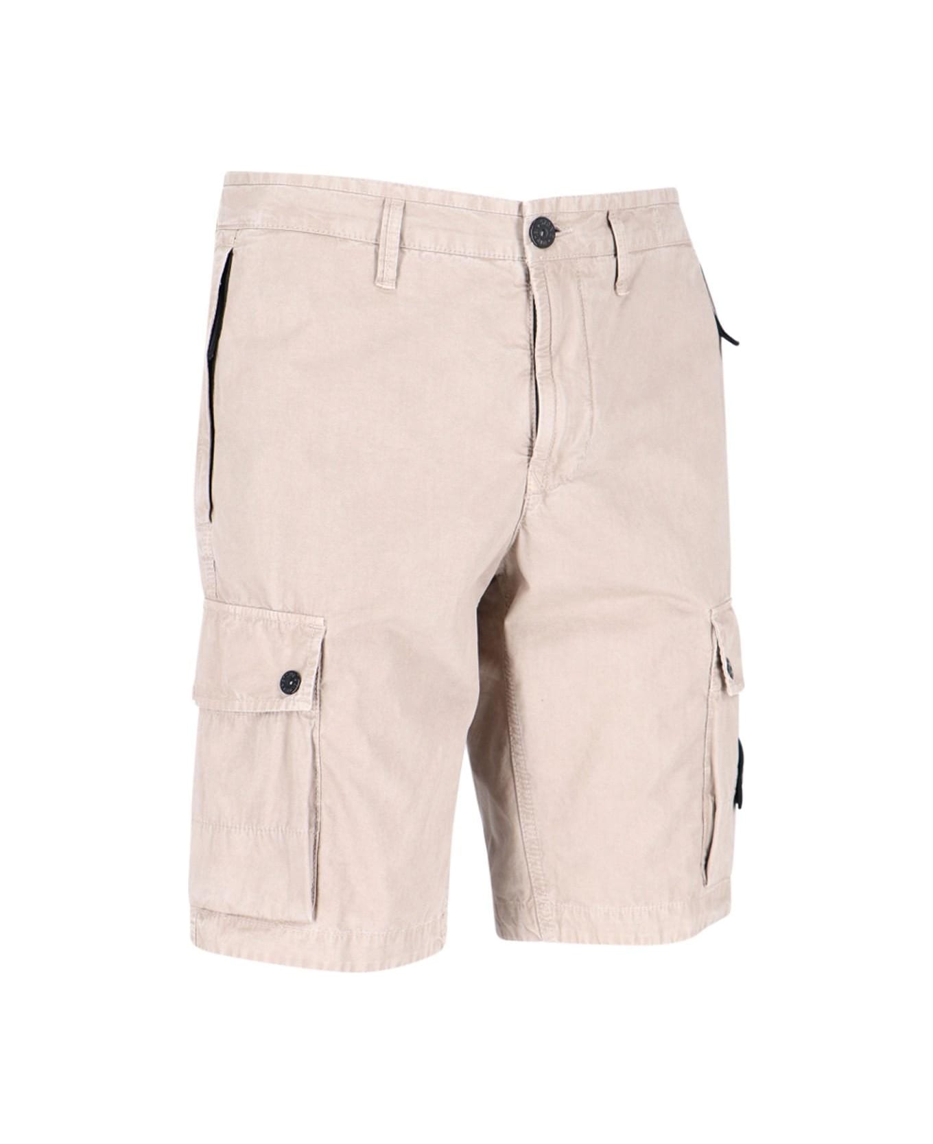 Stone Island beige cotton logo pants with belt loops, button and zipper closure, two side cargo pockets, contrast side logo patch, a back welt pocket and straight hem.