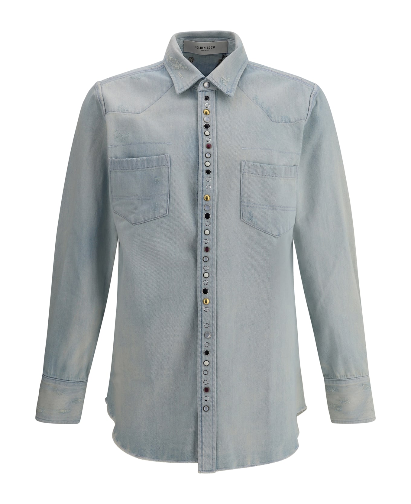 Axel cotton shirt by golden goose, crafted in a denim design with vintage appeal. it features a classic collar and a snap-button front closure for a practical, modern touch. two patch welt pockets on the front add functionality, while adjustable snap-button cuffs allow for a customized fit. the split hem and worn-effect design lend a vintage, worn-in look, making this shirt a uniquely contemporary style.