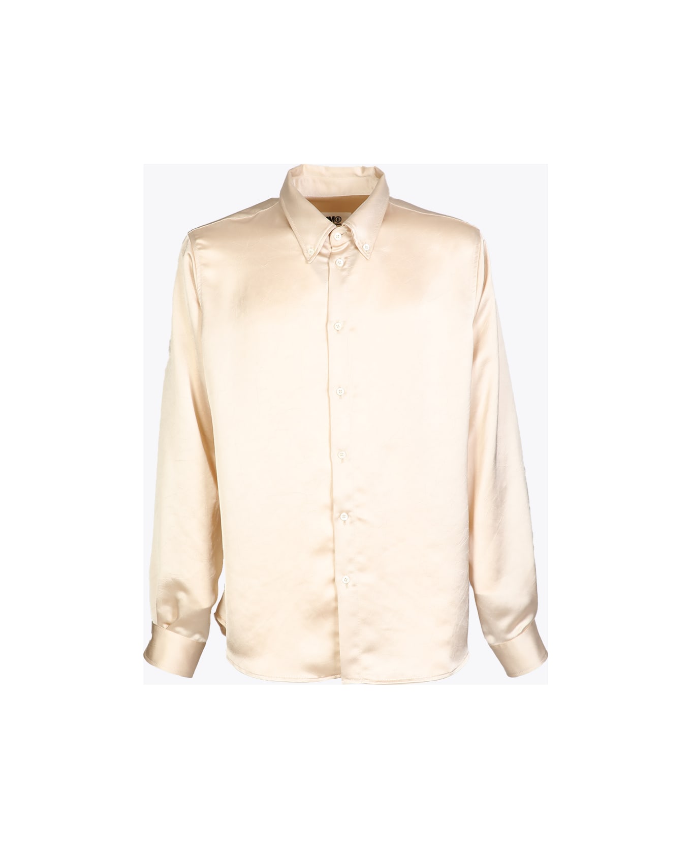 Beige creased satin shirt with long sleeves. Button-down collar. Relaxed fit. The model is 190 cm and wears size 50. Composition: 100% polyester. Made in Italy.
