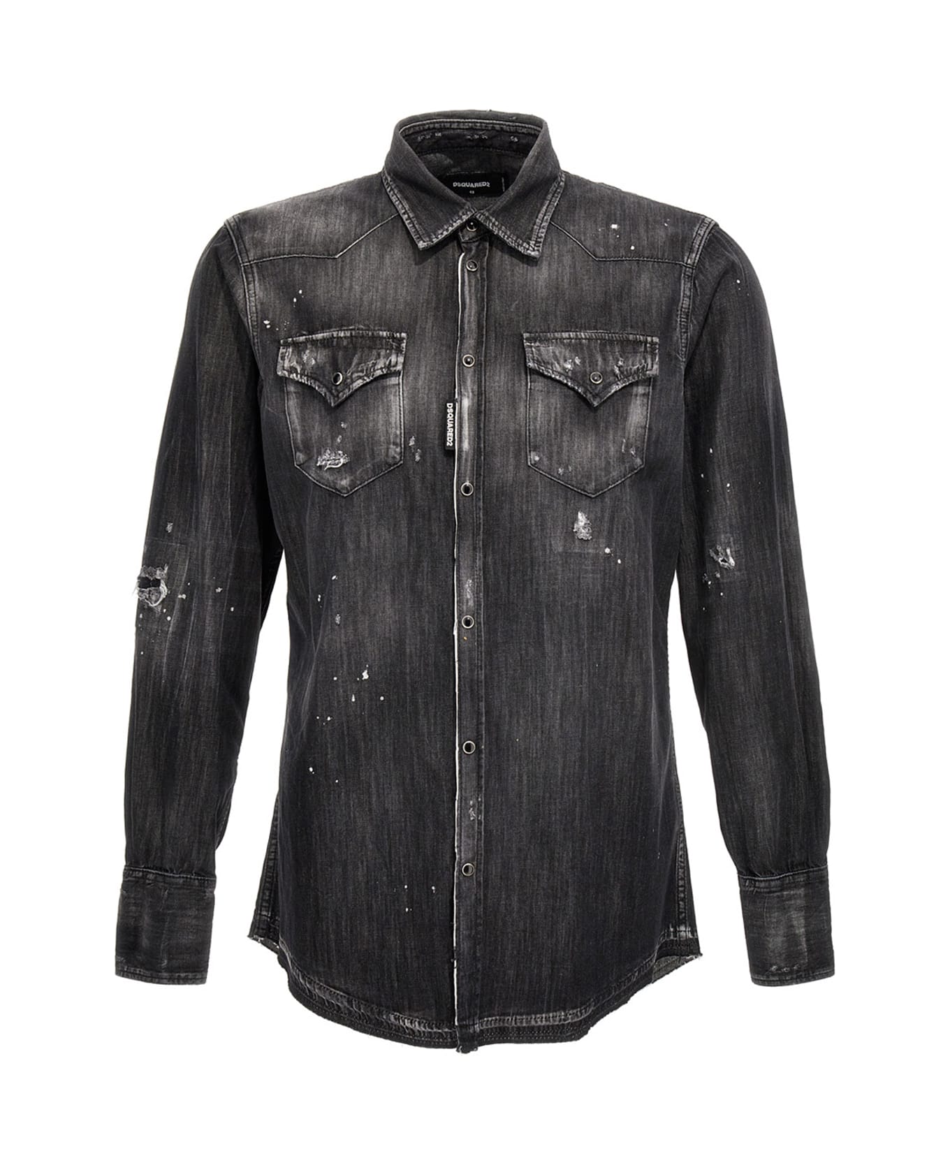 Classic Western' denim cotton shirt with used effect and stain details, a button closure, pockets, long cuffed sleeves and frayed hem.