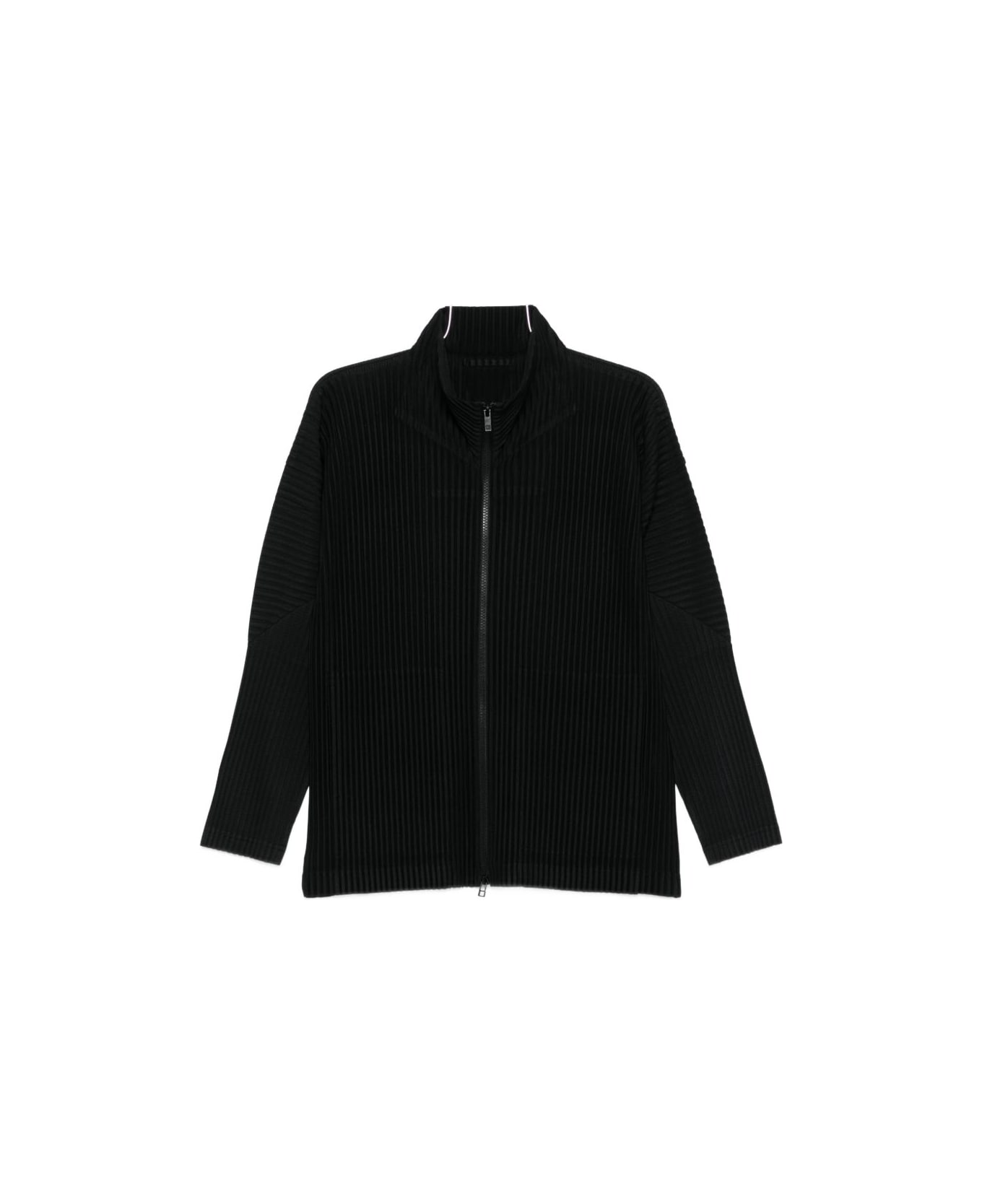 black pleated zip closure funnel neck long sleeves
