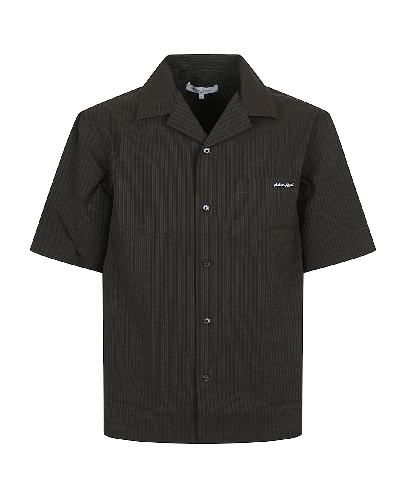 Seersucker shirt by MAISON KITSUNE. Shirt collar; short sleeves; engraved button closure; patch chest pocket; boxy fit design. Features Maison Kitsuné Handwriting signature woven label and striped fabric.