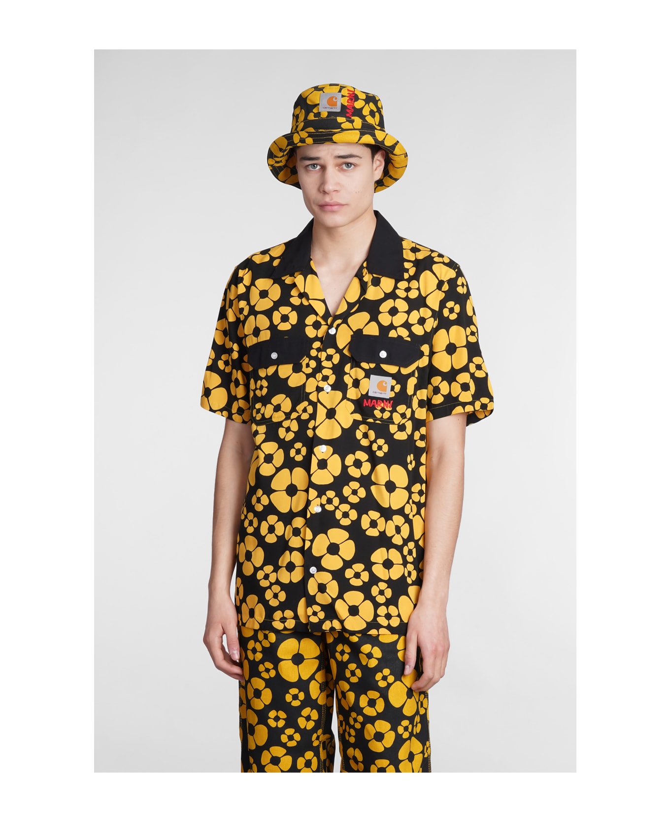 Shirt in yellow cotton, collar, frontal buttoning, short sleeves, chain print sole, flap pockets, logo patch on chest, Made in Cambogia, 100% cotton, Model is 1. 83 and wears size M