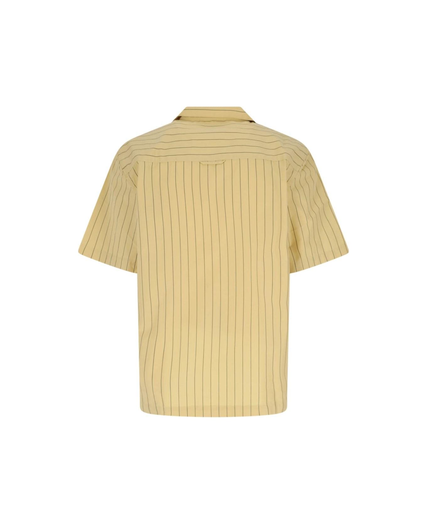 Carhartt WIP 'S/S Hendry' striped shirt in yellow cotton blend with striped pattern, camp collar, short sleeves, button closure, logo label detail, two chest button pockets, brown logo embroidery detail, straight hem.