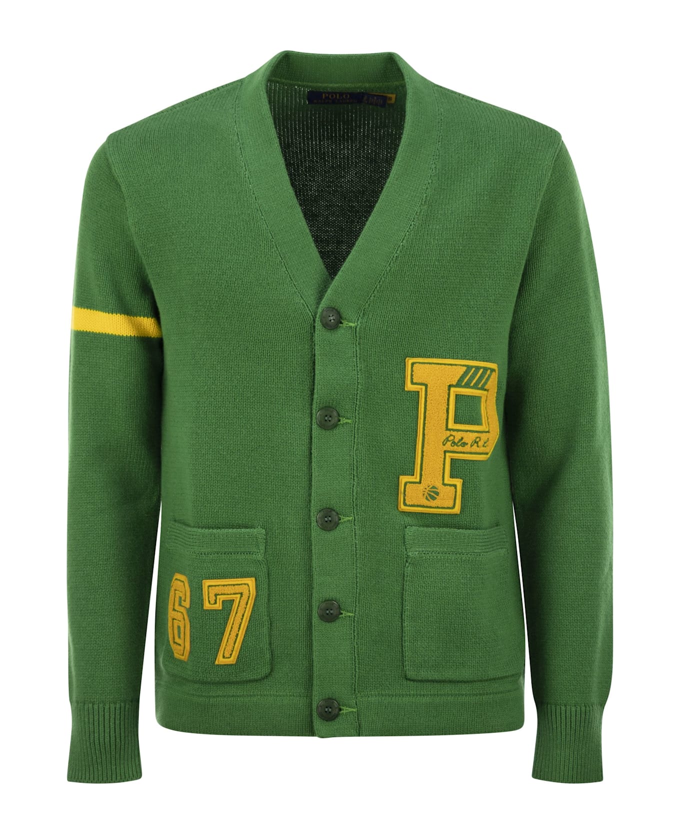 A series of exclusive appliqués and embroidery give this cardigan a college-style look. The pattern features the number 67 on the right pocket, a tribute to the founding year. - Regular-Fit: modern silhouette with a wider chest - V-neckline - Five-button closure - Corozo buttons - Embroidered Ralph Lauren label on inside of closure - Long sleeves with inlaid knit stripe on right sleeve - Ribbed cuffs - Chenille P applique with Polo R. L. lettering and basketball-themed embroidery on the left side of the chest - Two patch pockets at the waist on the front - Chenille applique with number 67 on right pocket DESIGNER ID: 710949299 001