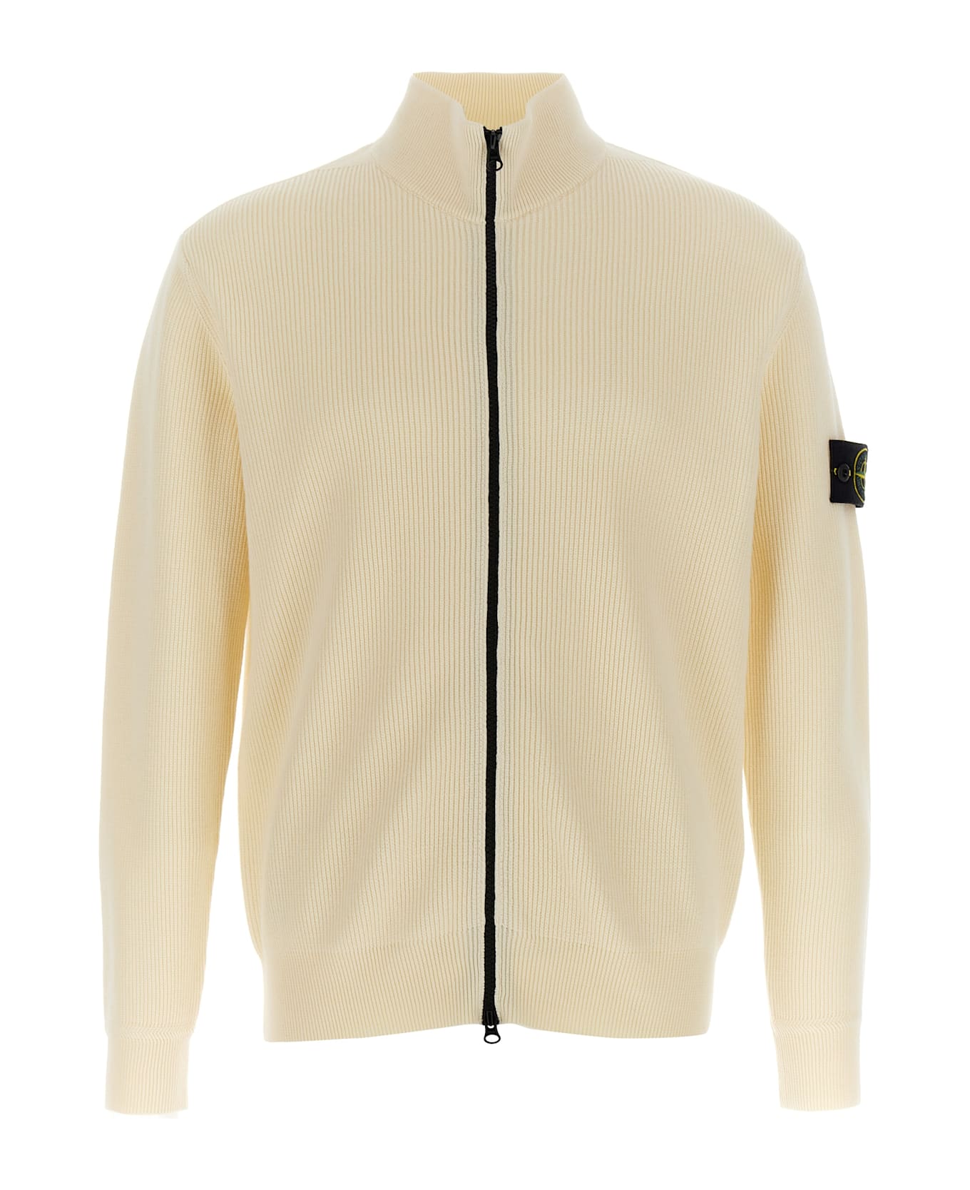 Knitted cotton cardigan, high neck, zip closure, long cuffed sleeves and logo badge. Composition: 100% cotton