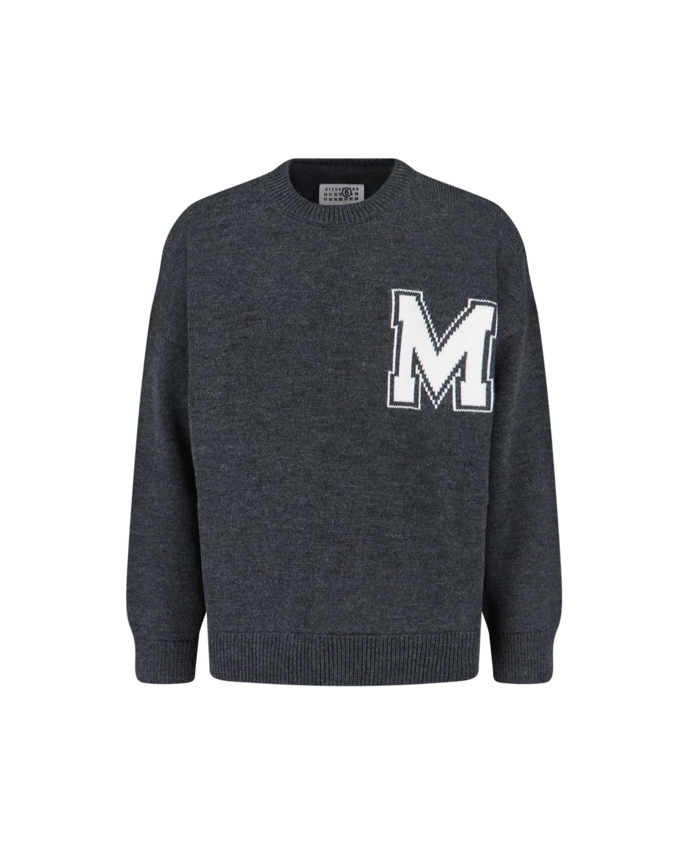 Maison Margiela MM6 logo sweater in dark grey virgin wool blend with crew neck, contrast logo on the front, iconic stitching at the back, ribbed trims, straight hem. Composition: 50% Virgin Wool, 50% Acrylic