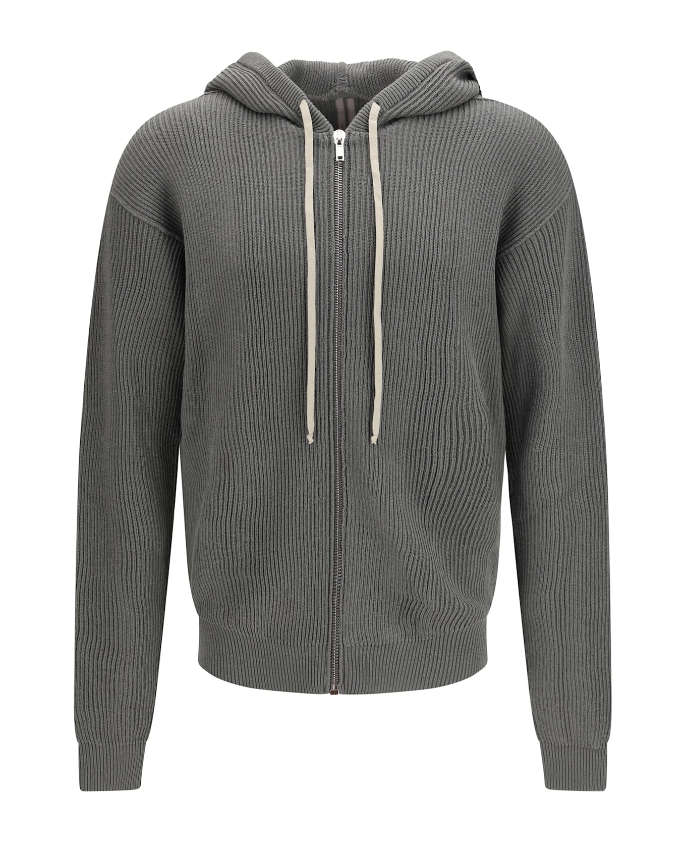 The ribbed virgin wool knit hoodie with front zip fastening and drawstring hood by rick owens reflects the designer s gothic and industrial aesthetic through a rich and enveloping construction. the ribbed knit pattern enhances textural depth, while ribbed cuffs and hem shape the silhouette with structure and balance. the virgin wool elevates comfort and craftsmanship, making this hoodie by rick owens a distinctive piece with intense contemporary character.
