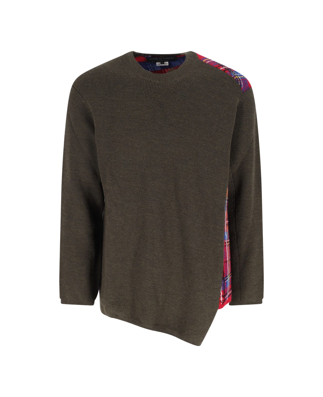 Comme des Garcons Homme Plus wool sweater, green on one side, multicolor check pattern on the other, crew neck, long sleeves, asymmetrical hem.