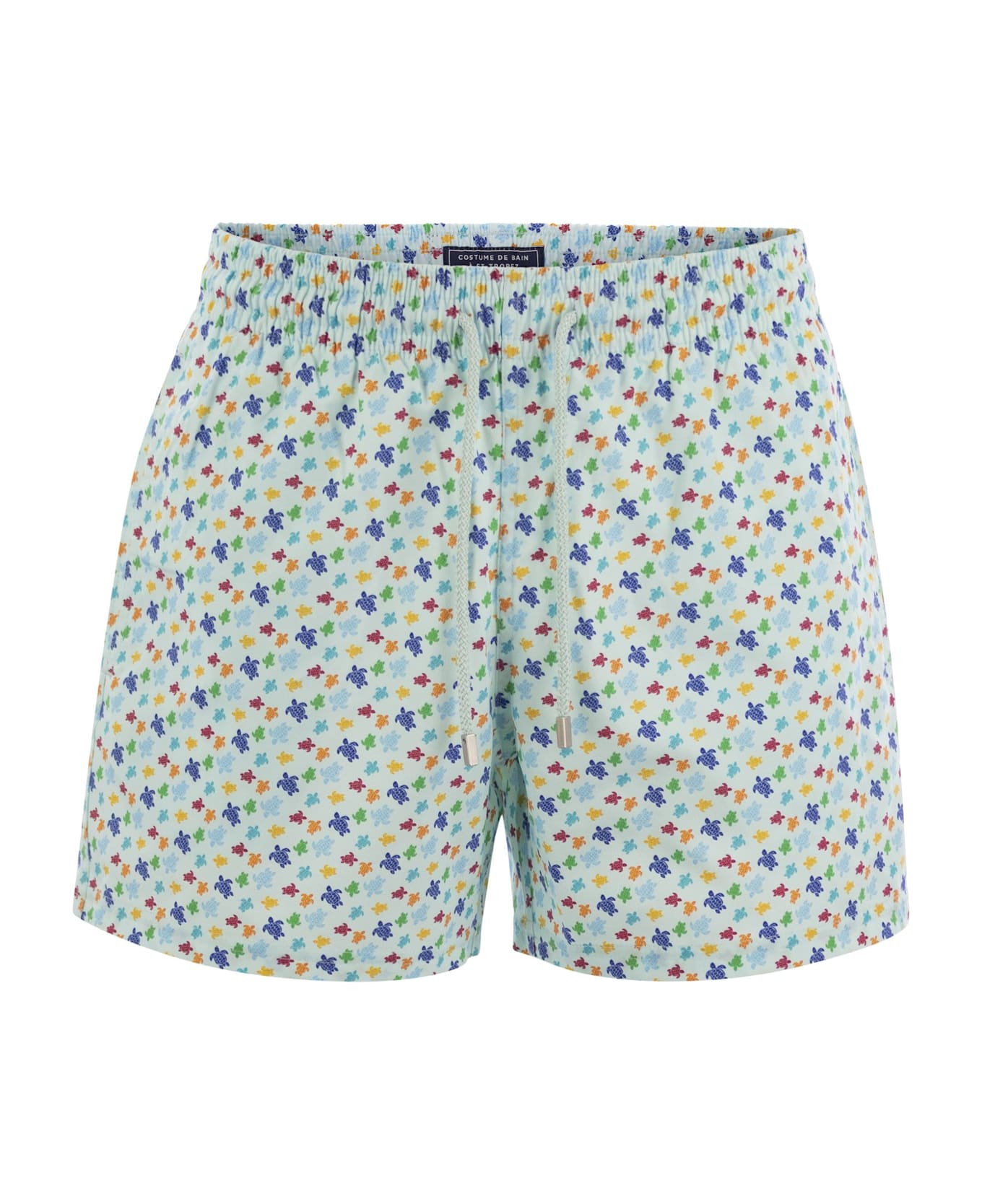These beach shorts decorated with tiny Vilebrequin turtles are made of recycled polyester and elastane to provide comfort and style. An elasticized waistband and drawstring with etched ends complete the garment. - Shorter cut swim shorts in stretch fabric - Elasticized waistband with drawstring and Vilebrequin logo engraved on zamak ends - Two side pockets and one back couture pocket with Velcro closure - Two back grommets allow water to drain away to reduce the balloon effect when exiting the water - Slightly shorter than the classic Moorea model DESIGNER ID: MSOCF139 315