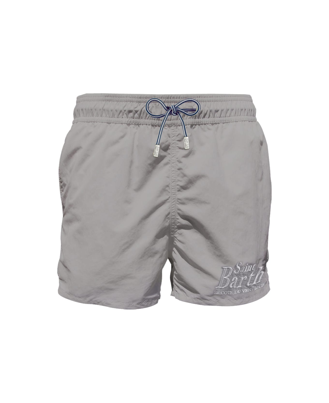 Men's Swim Shorts mid-lenght, silver microfibre, St. Barth front embroidered, regular fit, velvety hand feel fabric, comfortable drawstring waist, inside ergonomic brief, backside classic pocket with velcro closure. CARE INSTRUCTIONS