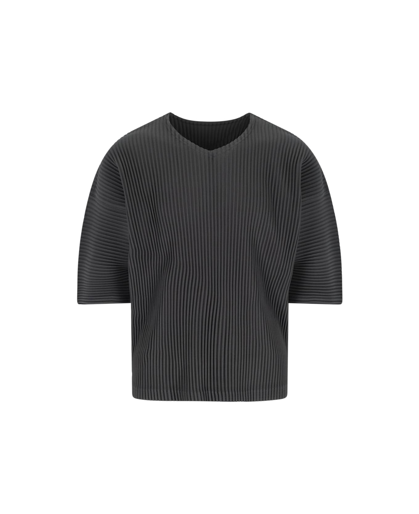 Homme Plissé 'MC March' pleated T-shirt in grey fabric with pleated design, V-neck, short sleeves, straight hem.