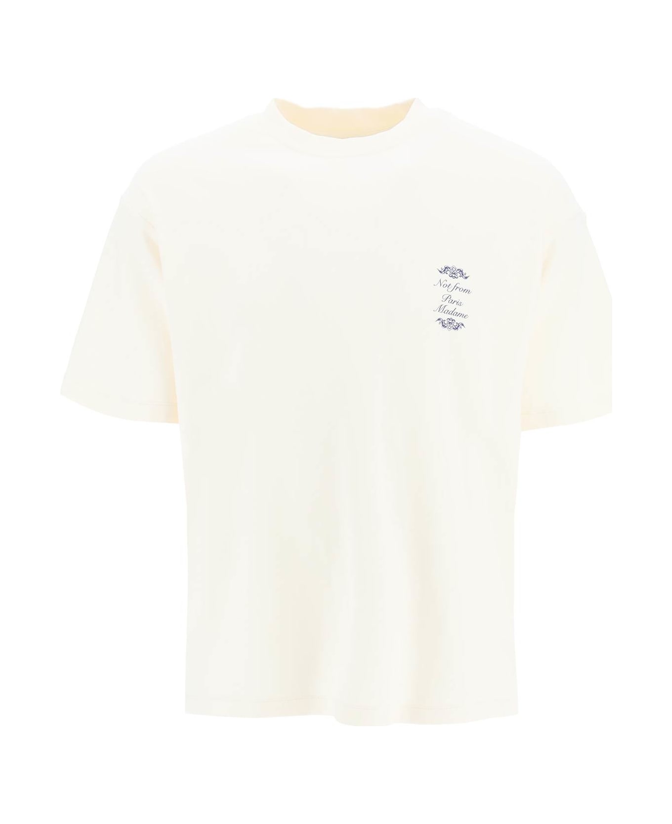 Crewneck cotton jersey t-shirt by Drôle de Monsieur, decorated with contrasting "Not from Paris Madame" print on the chest and with a maxi versione at back. Oversized fit. The model is 187 cm tall and wears a size M.