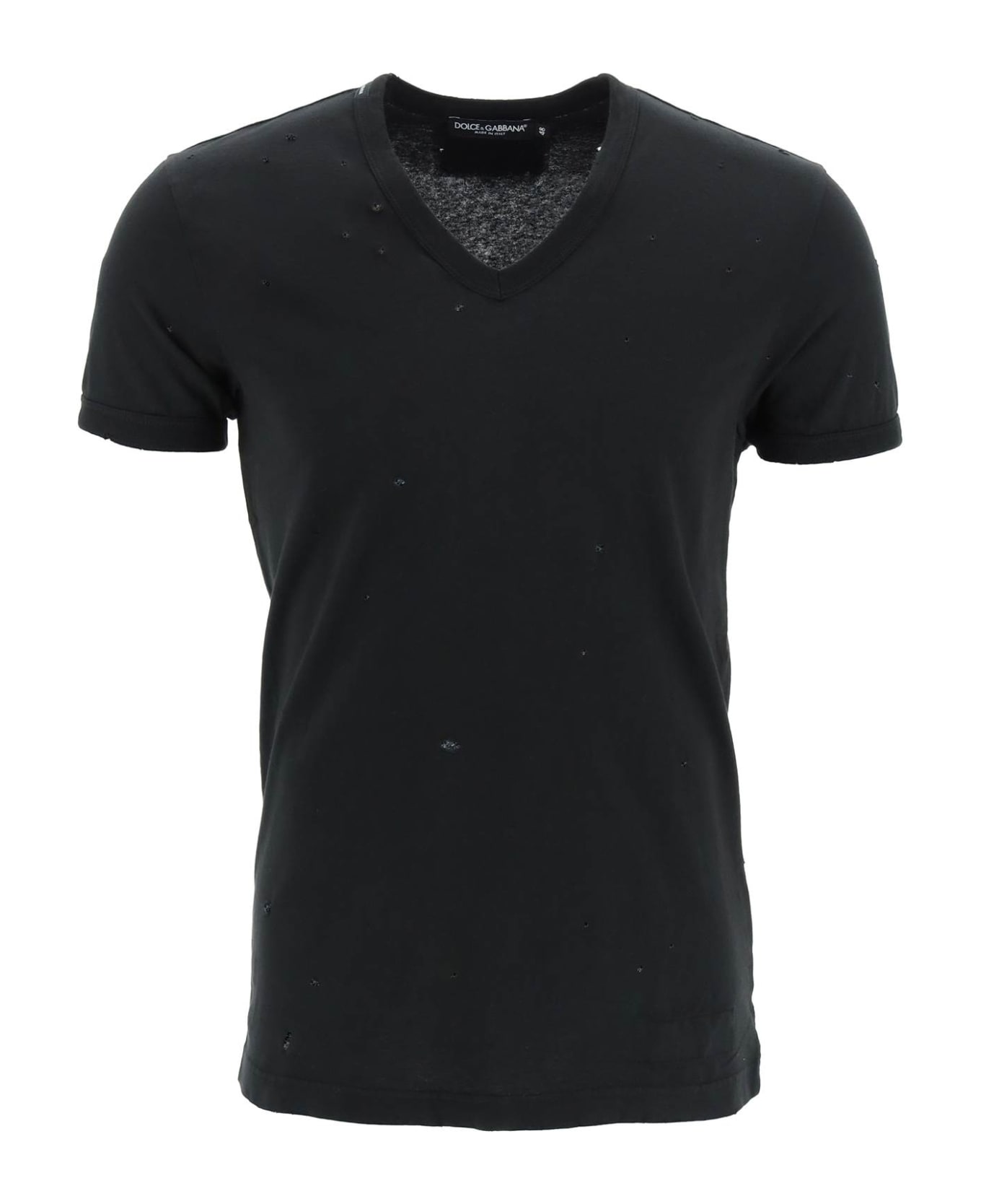 Dolce & Gabbana V-neck T-shirt from the Re-Edition series, inspired to archival garments. Made of pure cotton jersey with all-over destroyed detailing, it is finished with ribbed neck and cuffs, and sports a fabric label dedicated to the collection. Regular fit. The model is 187 cm tall and wears size IT 48.