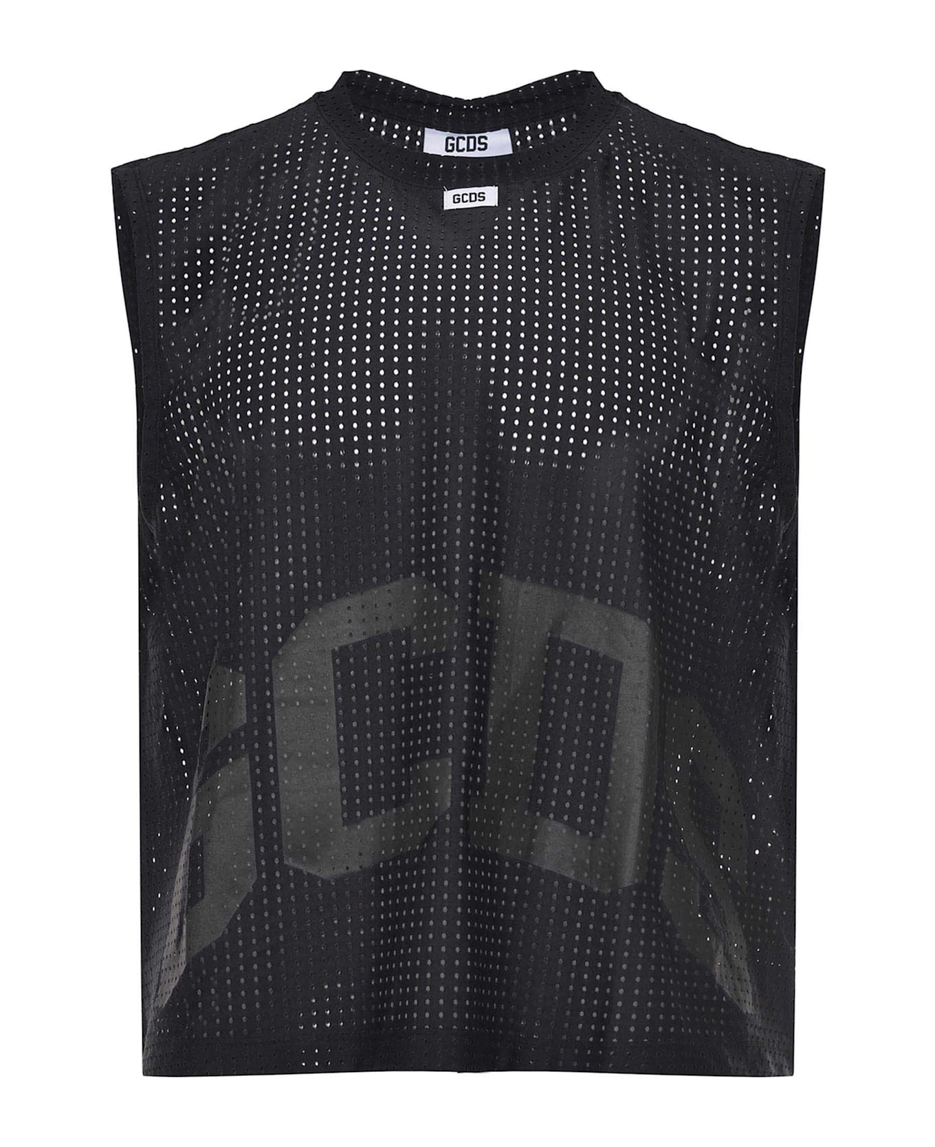 GCDS tank top made of black polyester blend. Entirely perforated. Sleeveless. Choker. Logo label on the chest. Logo lettering printed on the bottom on the front tone-on-tone. 78% polyester 22% elastane