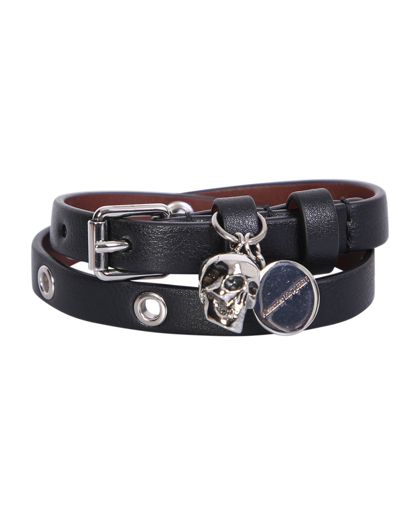 Buckle fastening. Adjustable fit. Skull charm. Engraved logo. Silver tone hardware. Color: black