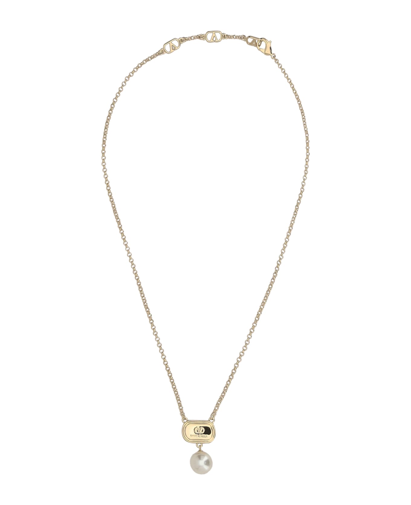 Valentino garavani's pearl pendant necklace features a classic clasp. the pendant is attached to a plaque, on which the brand's iconic vlogo is engraved. a refined and sophisticated piece of jewelry that combines the beauty of the pearl with valentino's distinctive symbol, perfect for adding a touch of class to any look. Composition: 100% % Brass