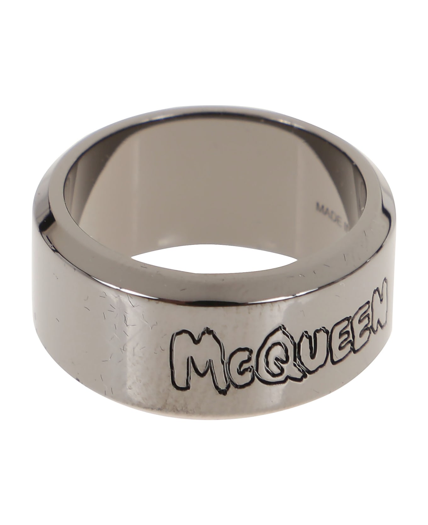 logo-engraved ring from Alexander McQueen featuring black, engraved logo, polished finish and slip-on style.