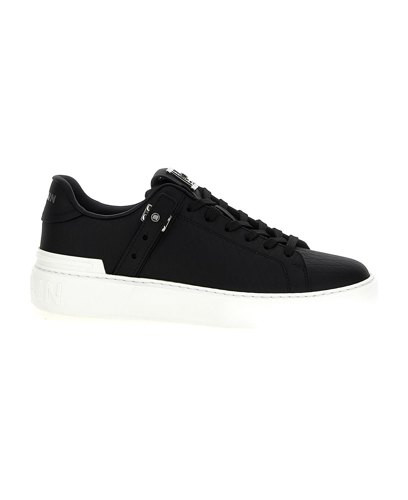 'B-Court B-Buzz' calf leather sneakers with diamond-shaped embossing, metal details, lace-up closure, trompe-l' the B-twist quarter-twist front metal clasp, contrast thick rubber sole.