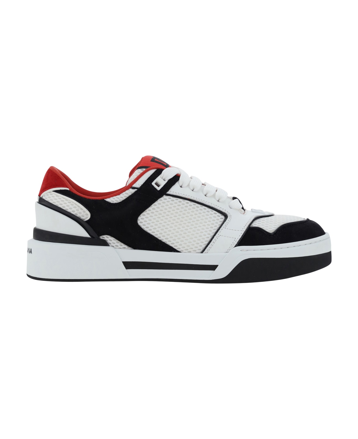 Calfskin sneakers by dolce&gabbana, featuring lace-up front closure, perforated round toe, platform sole with contrasting iconic monogram, front printed contrasting logo label, paneled design.