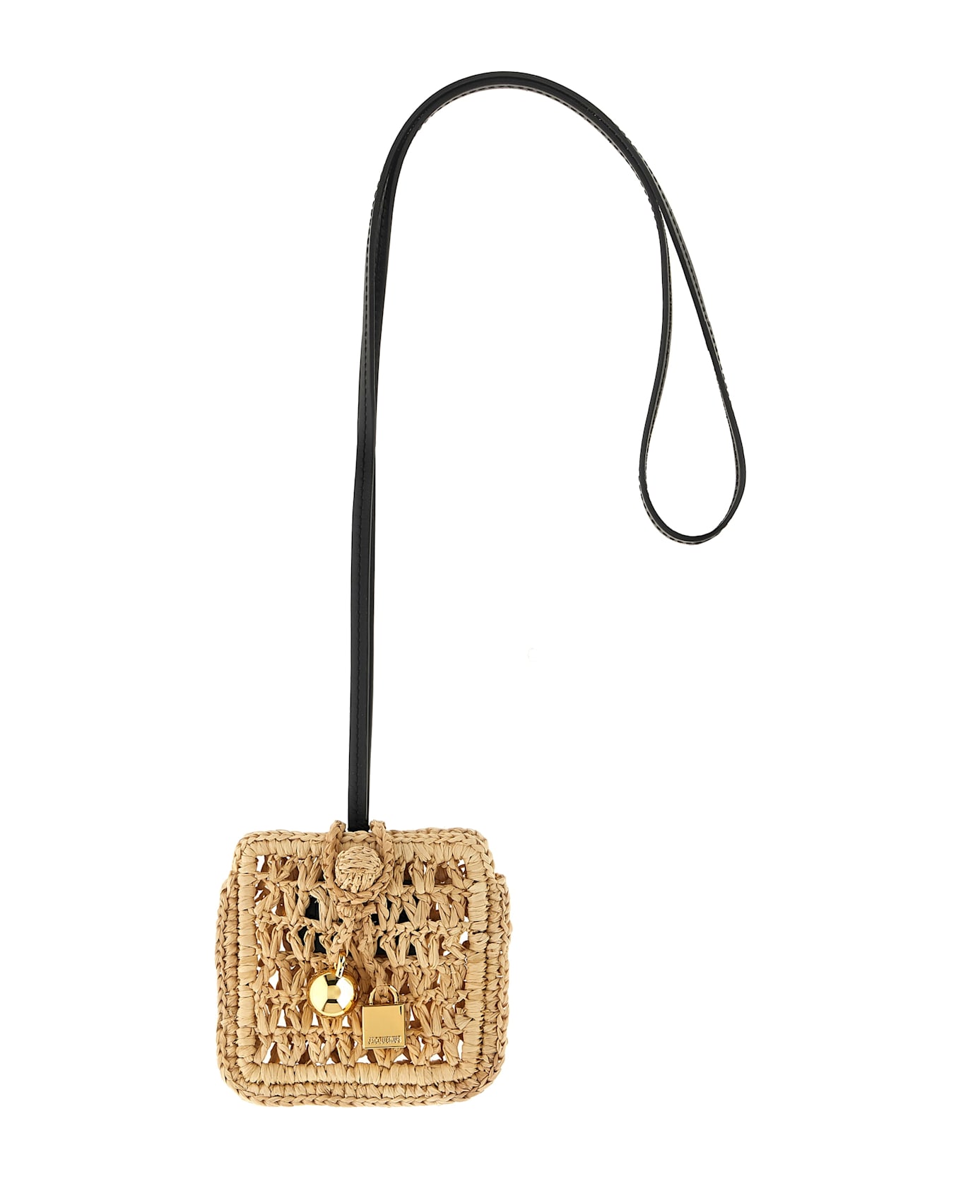 Braided raffia Le Porte Spiaggia AirPods case, leather strap, toggle closure, front metal pendant detail. Composition: 100% raffia