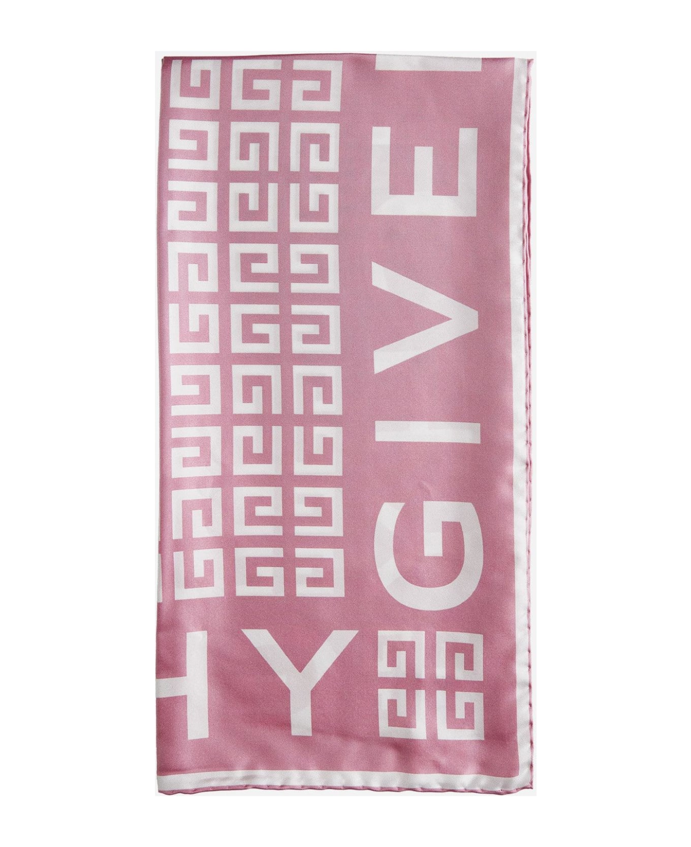 Givenchy's square silk scarf with white 4G Monogram and lettering logo print on a bright pink background.
