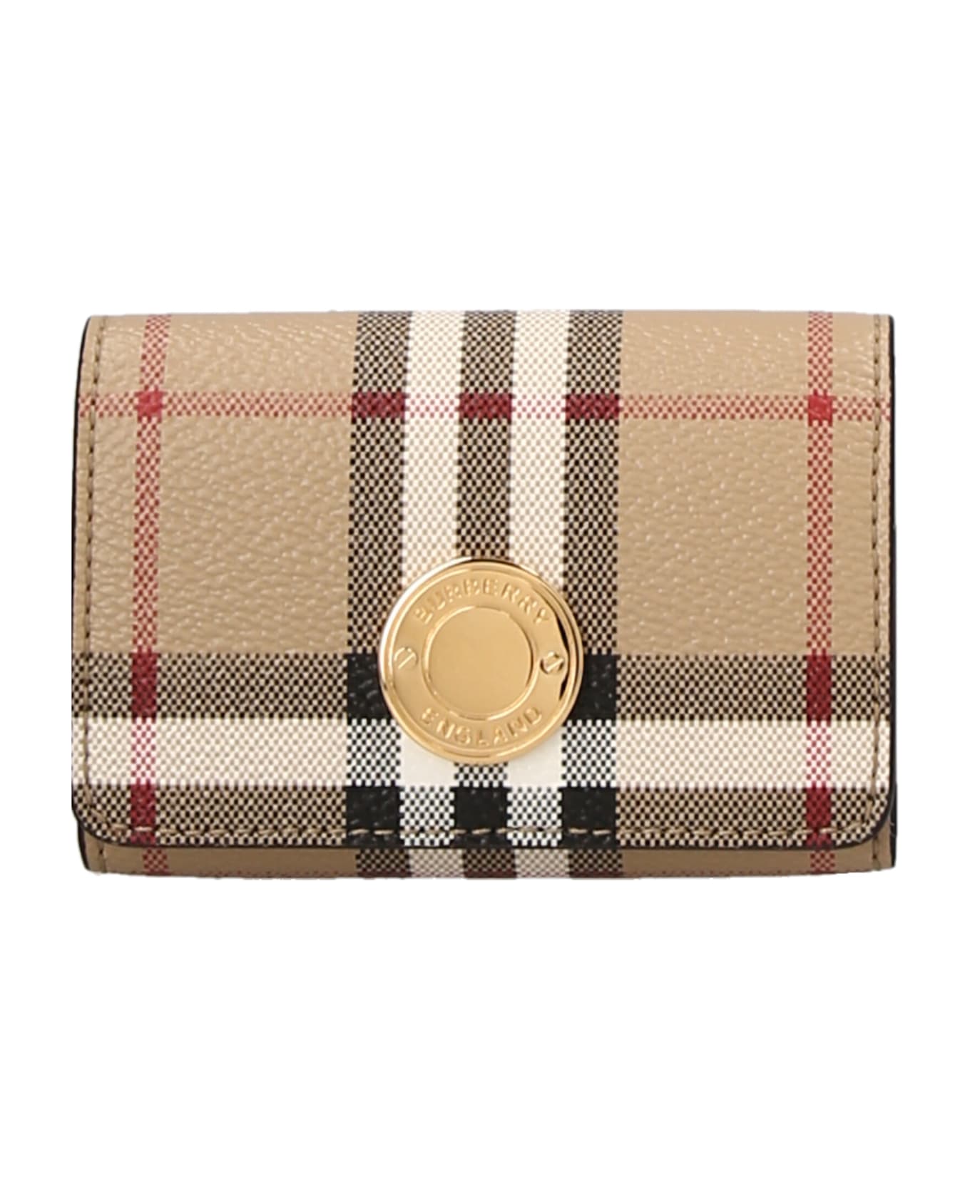 Compact' check print fabric wallet, with a front logo plaque, a button closure and a removable chain shoulder strap. Composition: