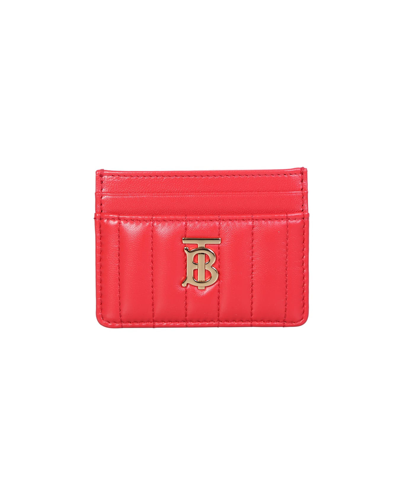 Signature TB monogram plaque. Gold-tone hardware. Quilted panels. Tonal stitching. Card slots. Color: Bright red