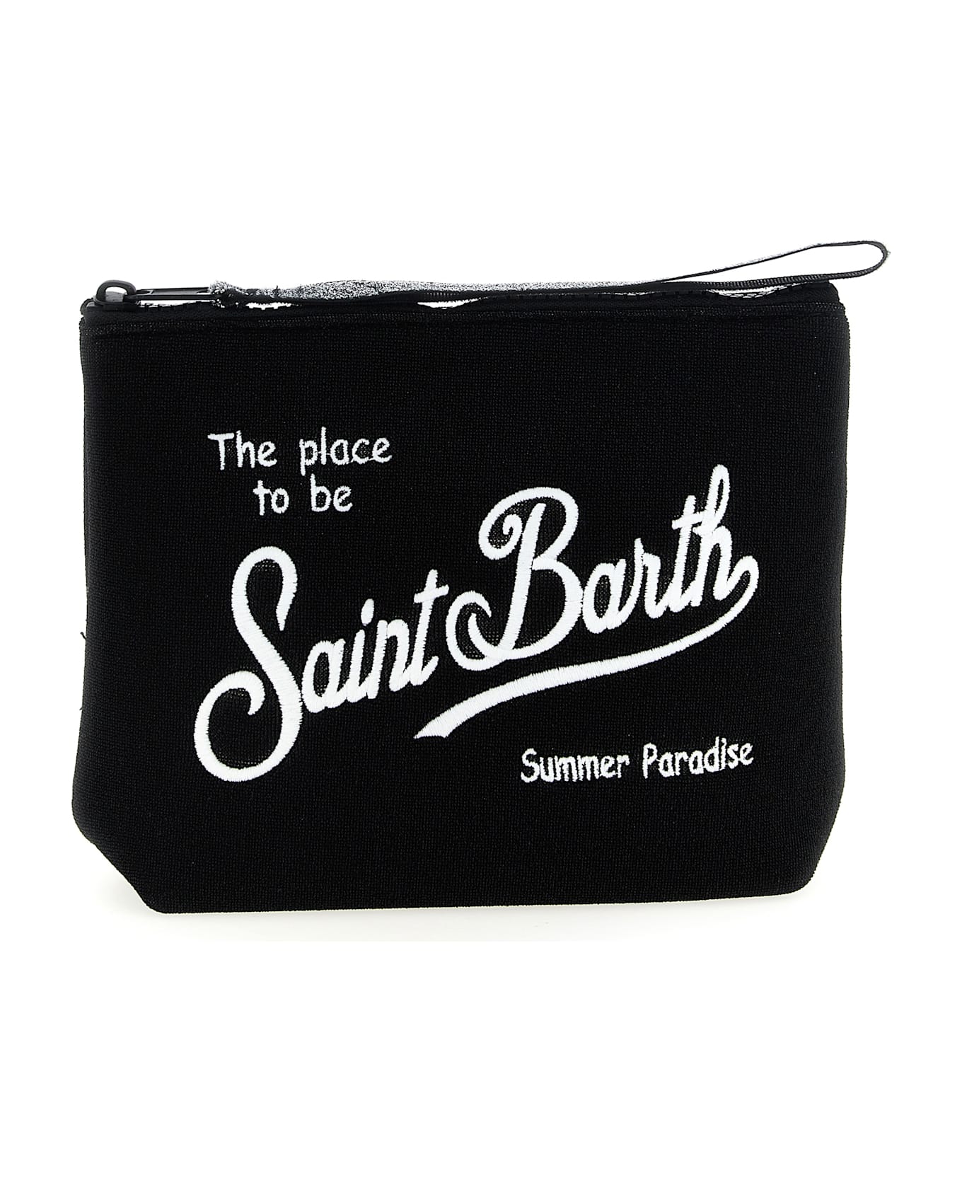Aline' lurex fabric clutch bag with scuba fabric lining, logo embroidery on the front and back, top zip closure, wrist handle. Composition: 70% sbr, 30% polyester