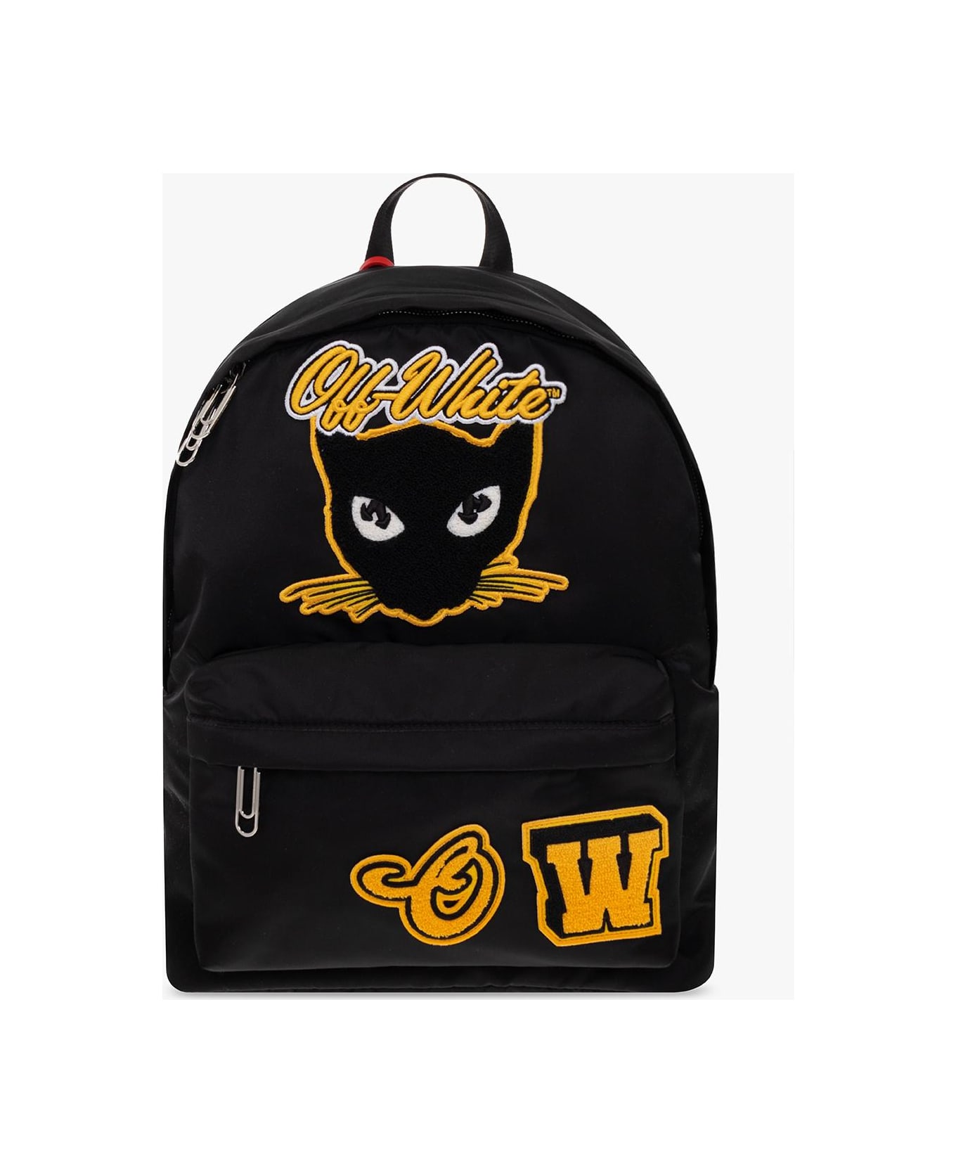 Black backpack from Off-White. Emblazoned with black, yellow and white logo patches, this design fastens with a zipper and features a zip front pocket, a half-round handle, adjustable shoulder straps, silver-tone metal hardware and one internal compartmen