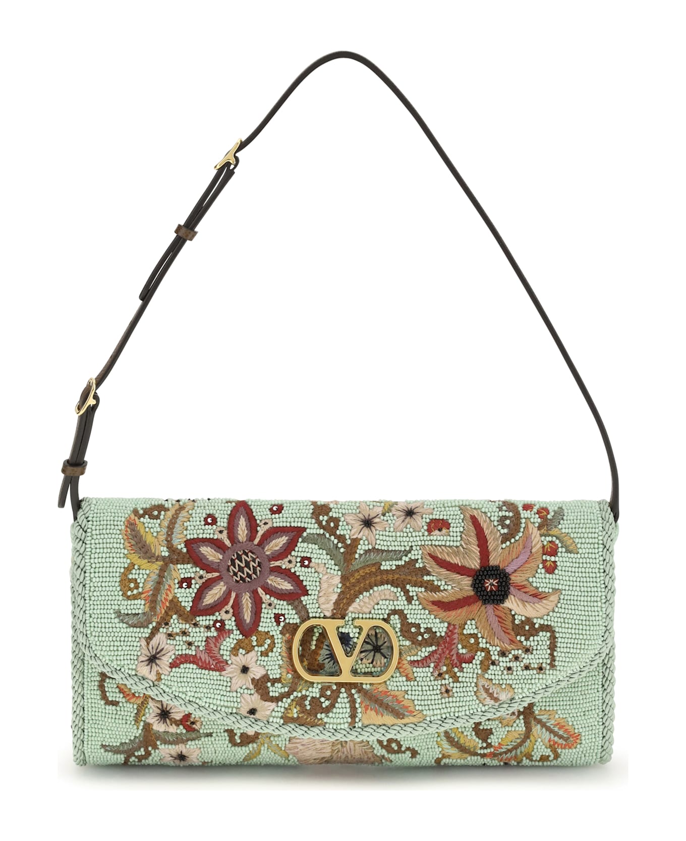The devain embroidered shoulder bag by valentino garavani is an elegant and sophisticated model, featuring refined floral embroidery on a black bead base and the iconic metallic vlogo signature element. featuring antiqued brass-finish hardware, it features grained calfskin details and an adjustable handle and magnetic closure with an antiqued brass vlogo, offering the option of carrying it by hand or over the shoulder with style and versatility.