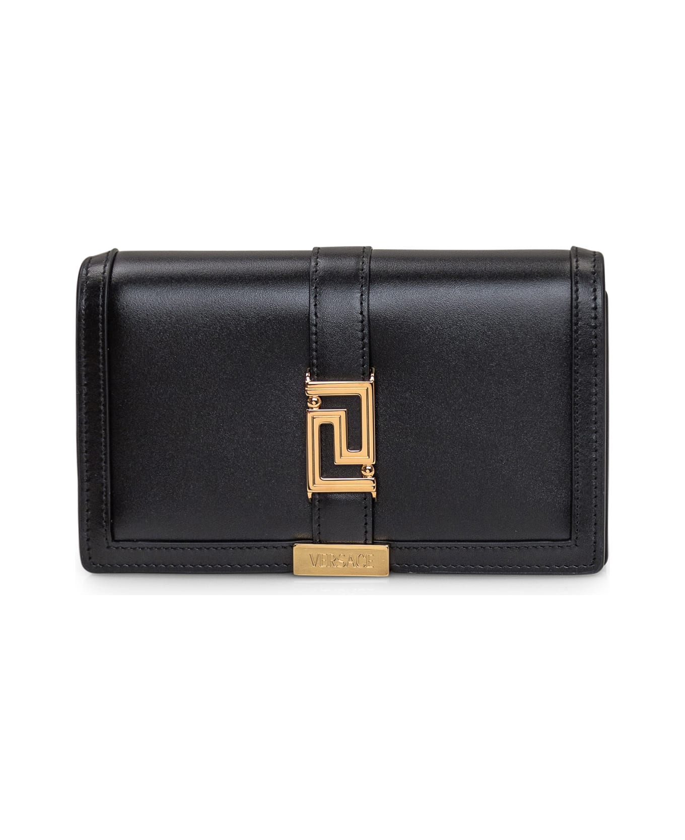 Black bag. Removable chain shoulder strap. Flap and button closure. Logo and Greca in metal on the front. Composition: Outside:, 100% Calfskin
