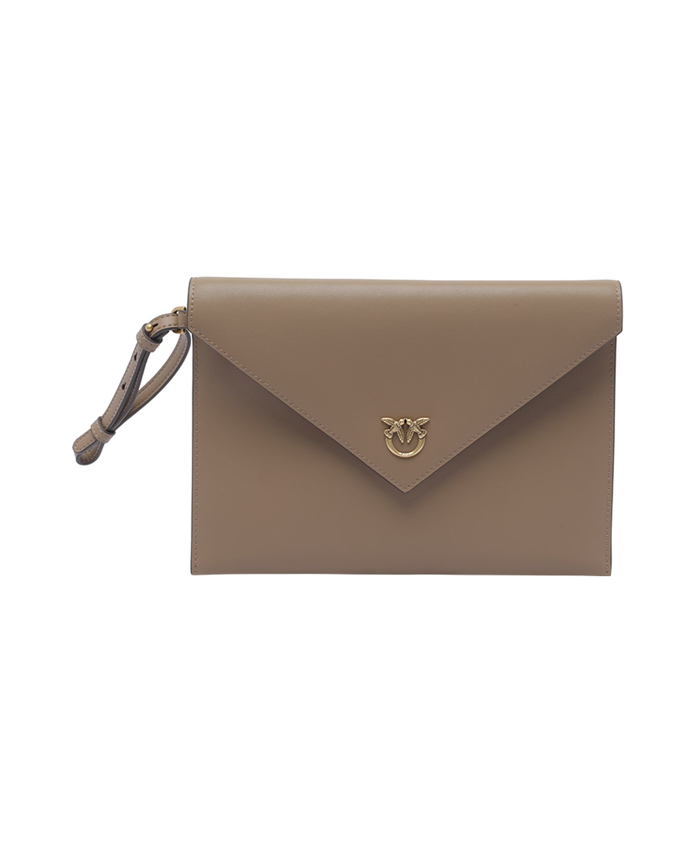 Pinko beige Love Birds flat pochette, clip closure, inner zipped pocket, wrist strap, frontal mini logo