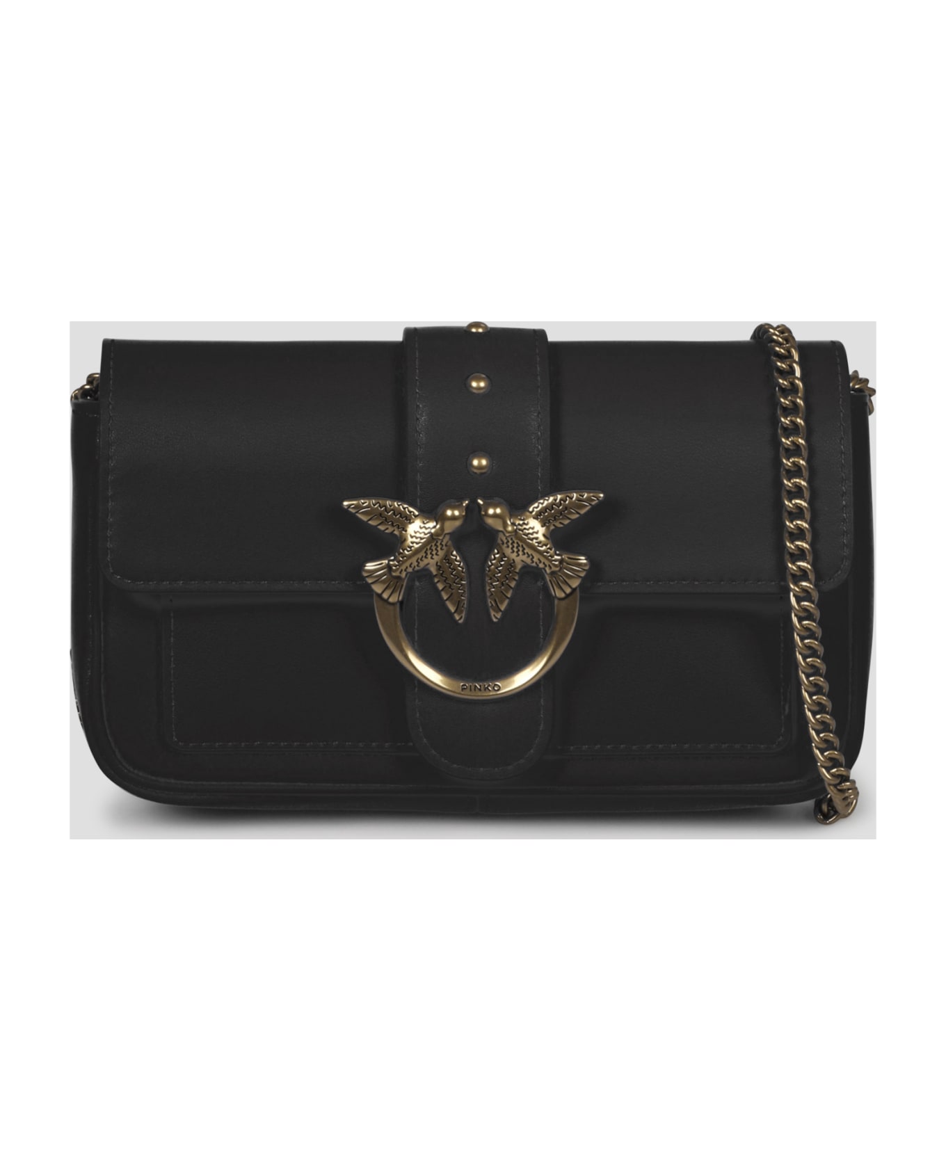 Pinko Pocket Love Bag One in silky-feel leather embellished with studded strap and a Love Birds Diamond Cut buckle. - SS23 - W:20cm H:12cm D:4cm - Removable chain shoulder strap - Extenal flap pocket on the back - Magnetic closure - Inside: 1 slip pocket, 1 main compartment, 1 zip pocket, 2 card slots - Finishes in antiqued gold metal - Made in China - 100% Calf leather
