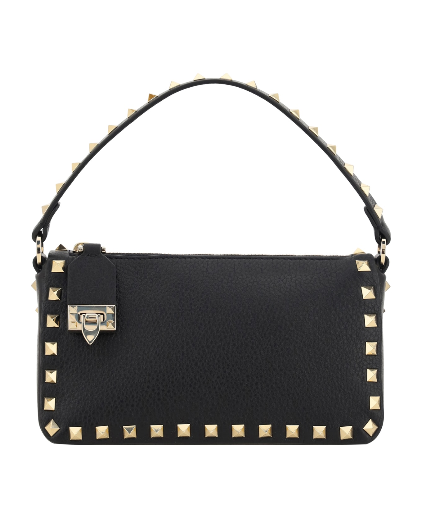 Calfskin rockstud small handbag by valentino garavani, grained leather design, beading made with the brand's iconic studs applied on front and back, top zipper closure, applied hook-and-eye closure detail on front to lock the slider, iconic brand monogram printed in pressure and contrast on front, removable leather shoulder strap. Composition: 100% % Calf Leather Bos Taurus
