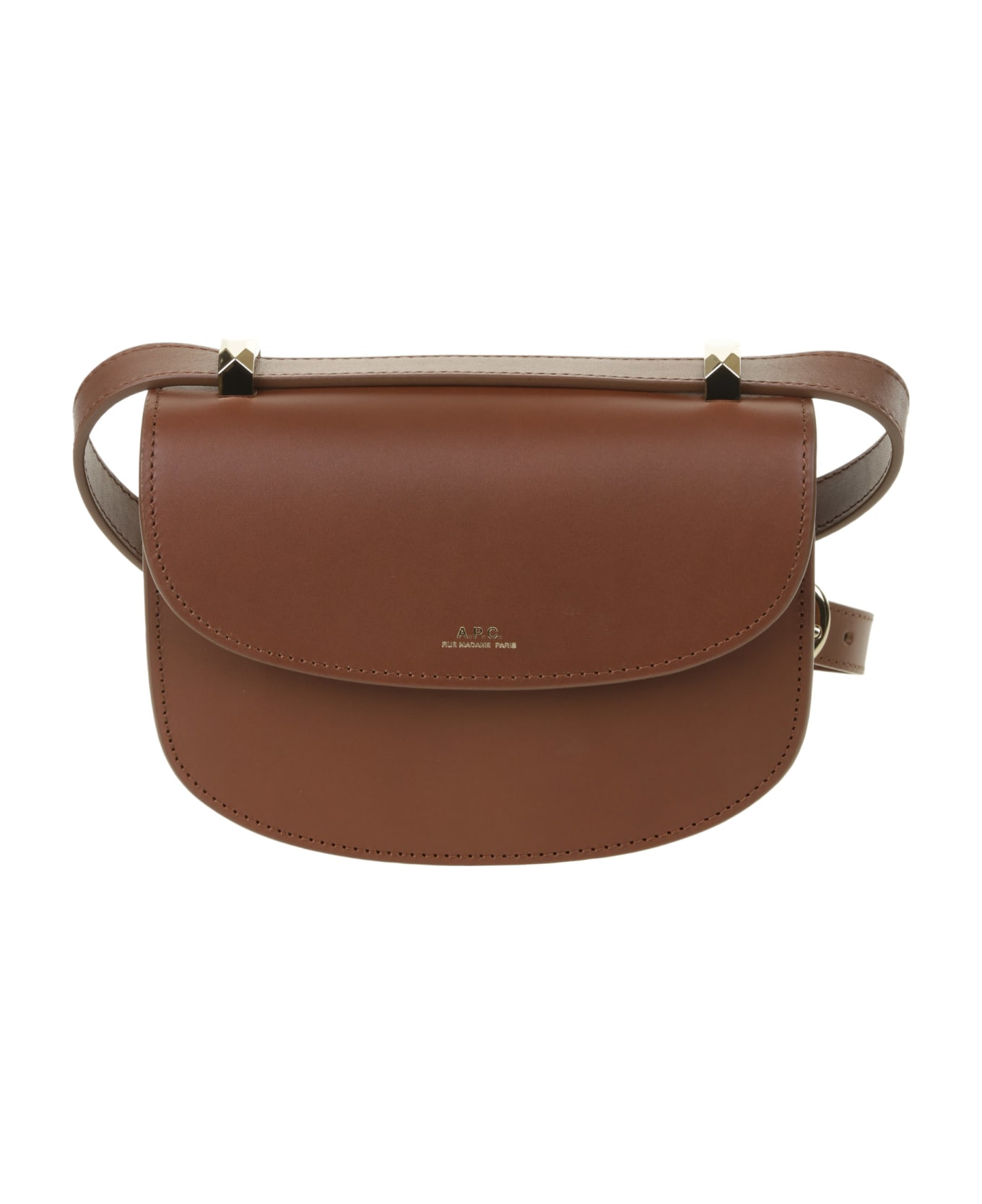 A. P. C. Tan leather bag, adjustable shoulder strap, clip closure, front logo.