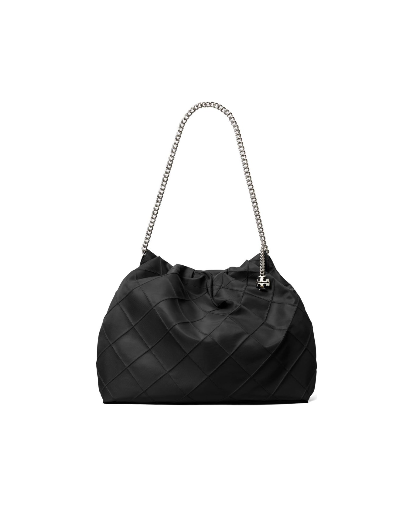 Diamond pattern pintucks get a sporty update on our Fleming Nylon Hobo Bag. Made of 100% recycled nylon, the slouchy silhouette is designed with a chain strap and Double T charm. outer shell: 100% recycled nylon; napa leather trim lining: 80% recycled polyester, 20% cotton magnetic snap closure double chain shoulder straps with 11. 8" (30cm) drop 1 interior front wall pocket, 1 interior zipper pocket hanging metal logo charm pintuck quilting technique