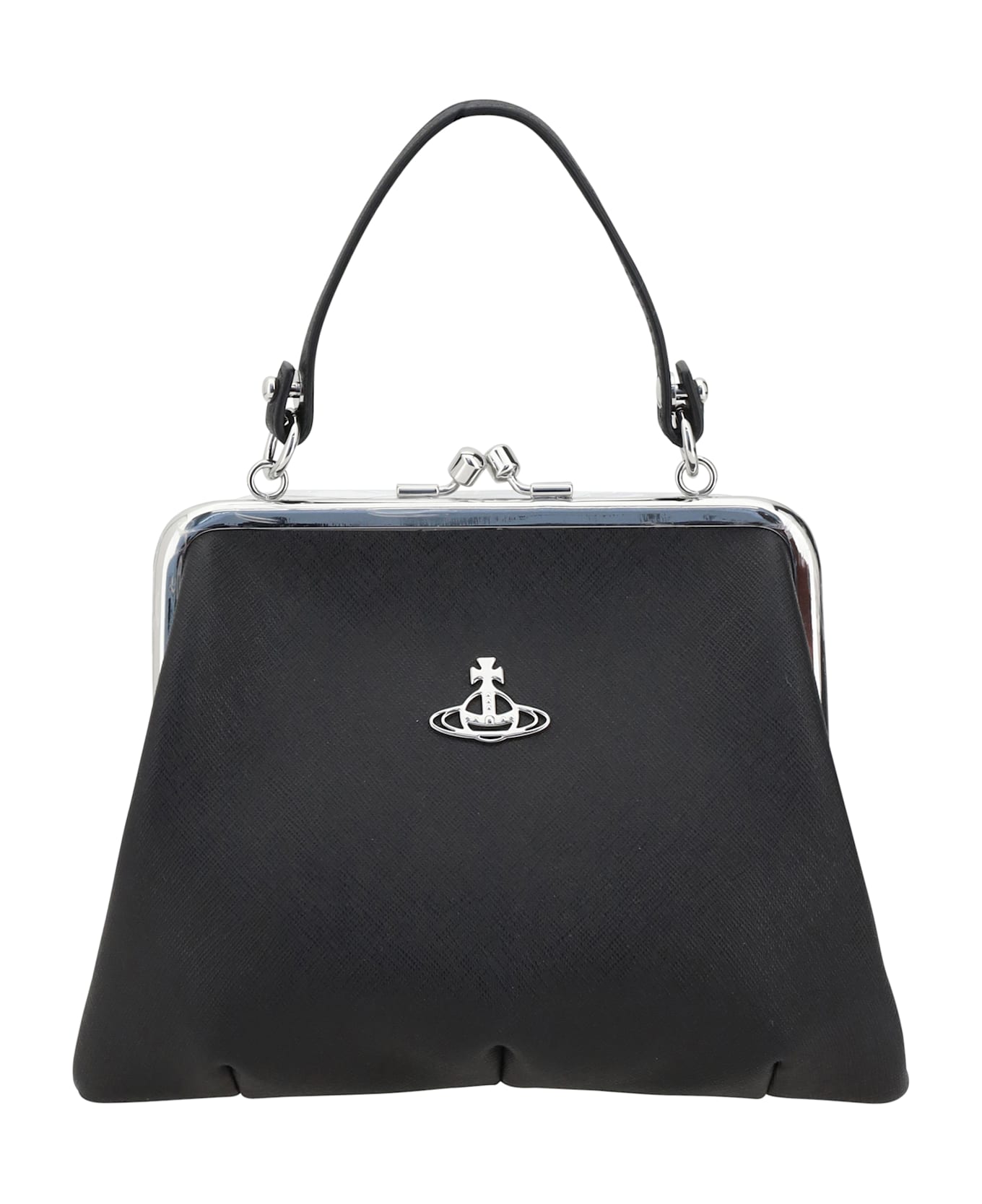 The vivienne westwood granny handbag is an elegant and sophisticated accessory that combines practicality with a distinctive design. the flat top handle offers a comfortable grip, while the removable chain strap adds versatility, allowing it to be carried both by hand and on the shoulder. the pebbled leather design gives the bag a rich and structured look, while the brand's iconic orb logo applied to the front adds a touch of luxury and recognition. with a single compartment and snap closure, this bag is perfect for those looking for an elegant yet functional accessory, ideal for completing sophisticated looks with a unique touch of style.