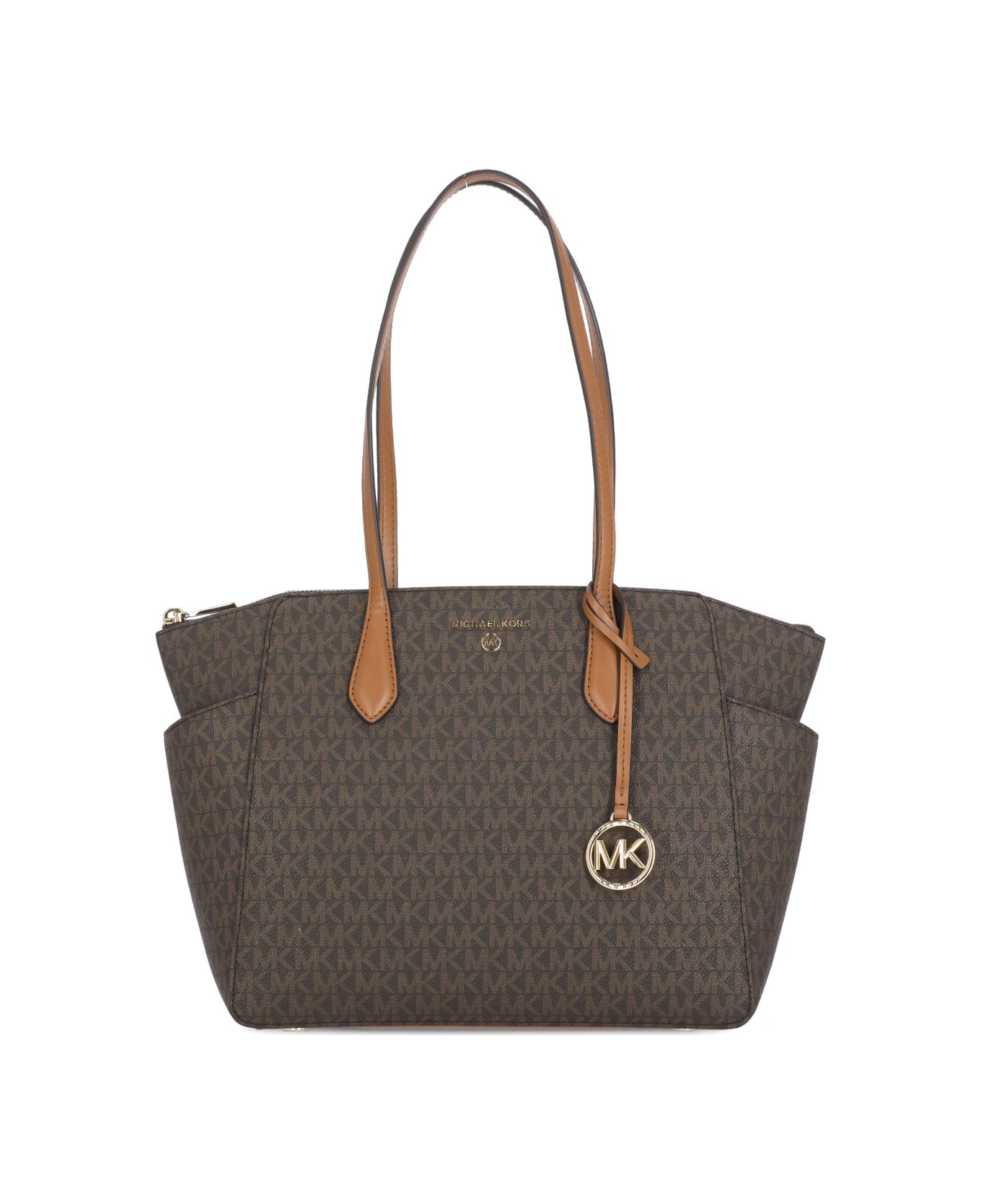 Marylin Shoulder Bag from MICHAEL Michael Kors: - Michael Kors brown fabric shoulder bag for woman - Front relief Michael Kors logo - Charm with Michael Kors monogram - Two handles - One front hidden slit pocket - Two side slit pockets - Lining with all-over Michael Kors monogram - One main compartment with zip fastening - Three internal slit pockets