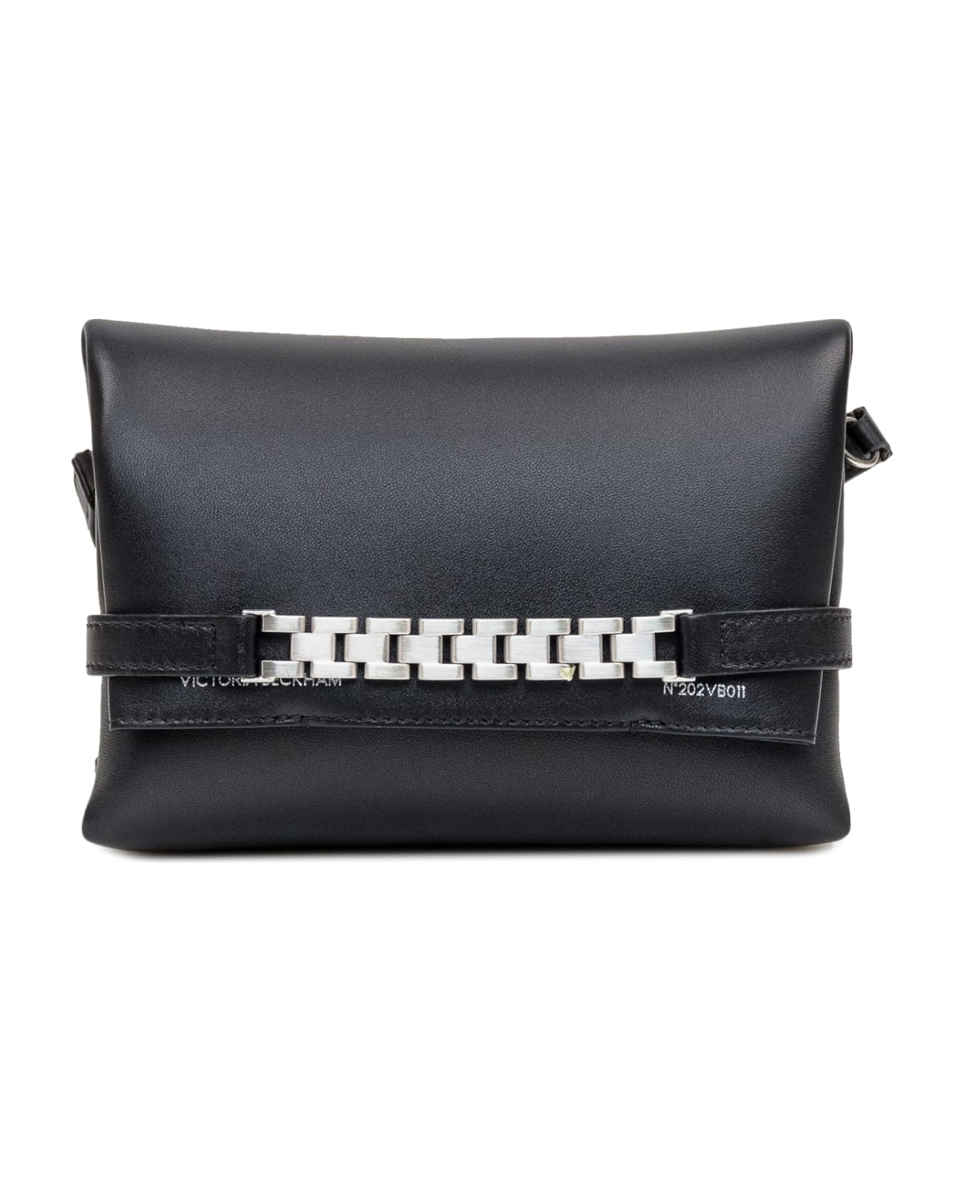 Black leather bag. Removable shoulder strap. Two internal compartments. Flap closure. Chain on the front. Logo on the front.
