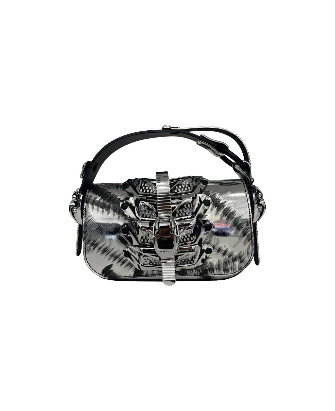 Innerraum Object C02 SHOULDERBAG in distressed silver color, adjustable strap, adjustable closure with details of elements from motorcycle suits. GTIN code: C02DSBKPV00