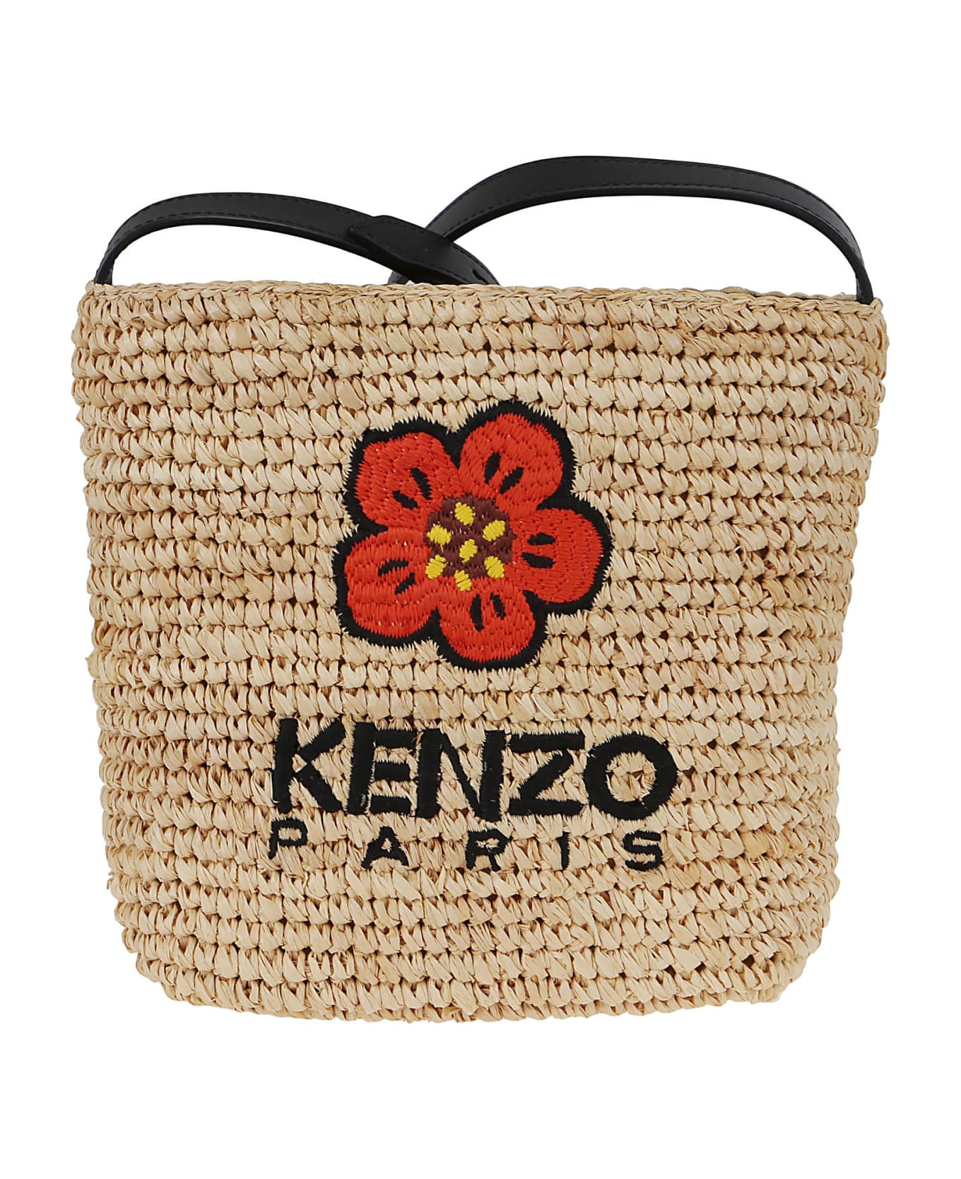 Raffia mini bucket bag BY KENZO. Inspired by the raffia basket with an internal zip pocket; magnetic closure. `BOKE FLOWER` detail and KENZO Paris logo embroidered on the front.
