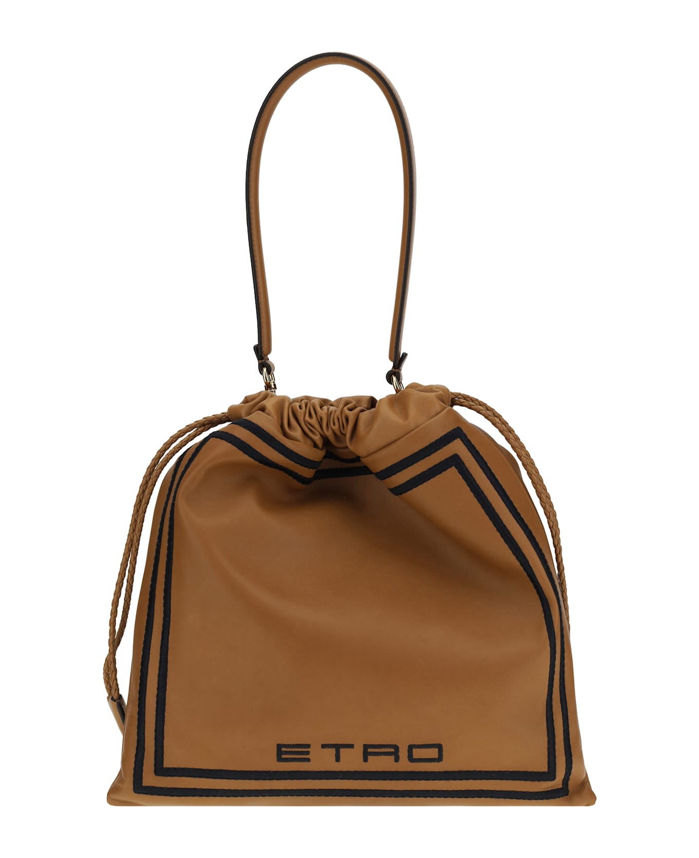 The kalispera medium shoulder bag from etro has a pouch design, crafted from leather and embellished with contrasting floral embroidery that enhances its elegance. the braided drawstring closure adds a touch of sophistication, while the removable handle offers the option of carrying it by hand or on the shoulder. inside, a patch pocket provides practicality, while the brand's iconic signature embroidered on the back underscores its prestige. a versatile and distinctive accessory, perfect for any occasion.