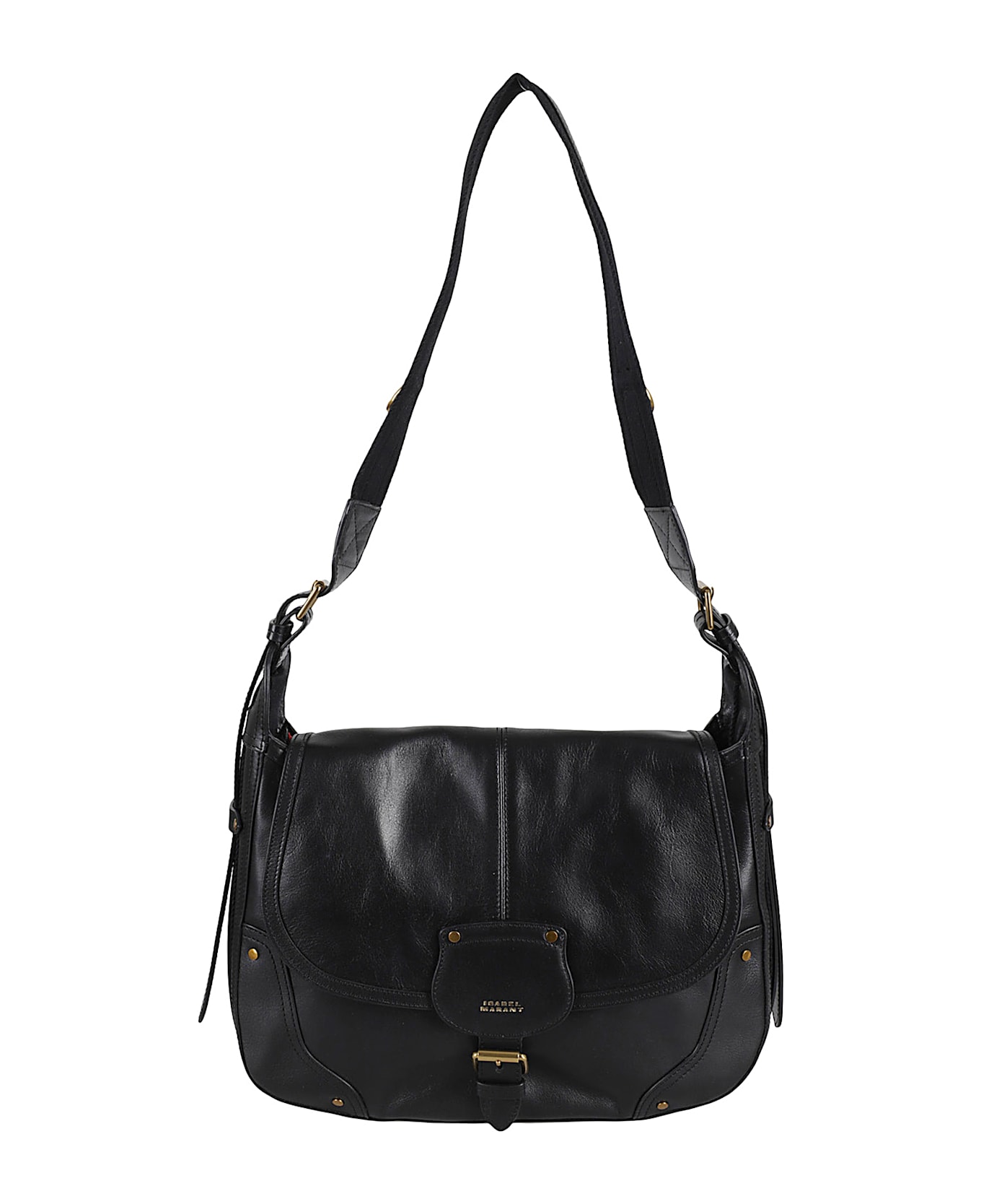 Sierra Shoulder Strap bag - Isabel Marant - brown color - flap with magnetic buckle closure - adjustable leather and twill shoulder strap with buckles - vintage leather and studded button details - imprinted logo on front - brushed gold metal details - Si