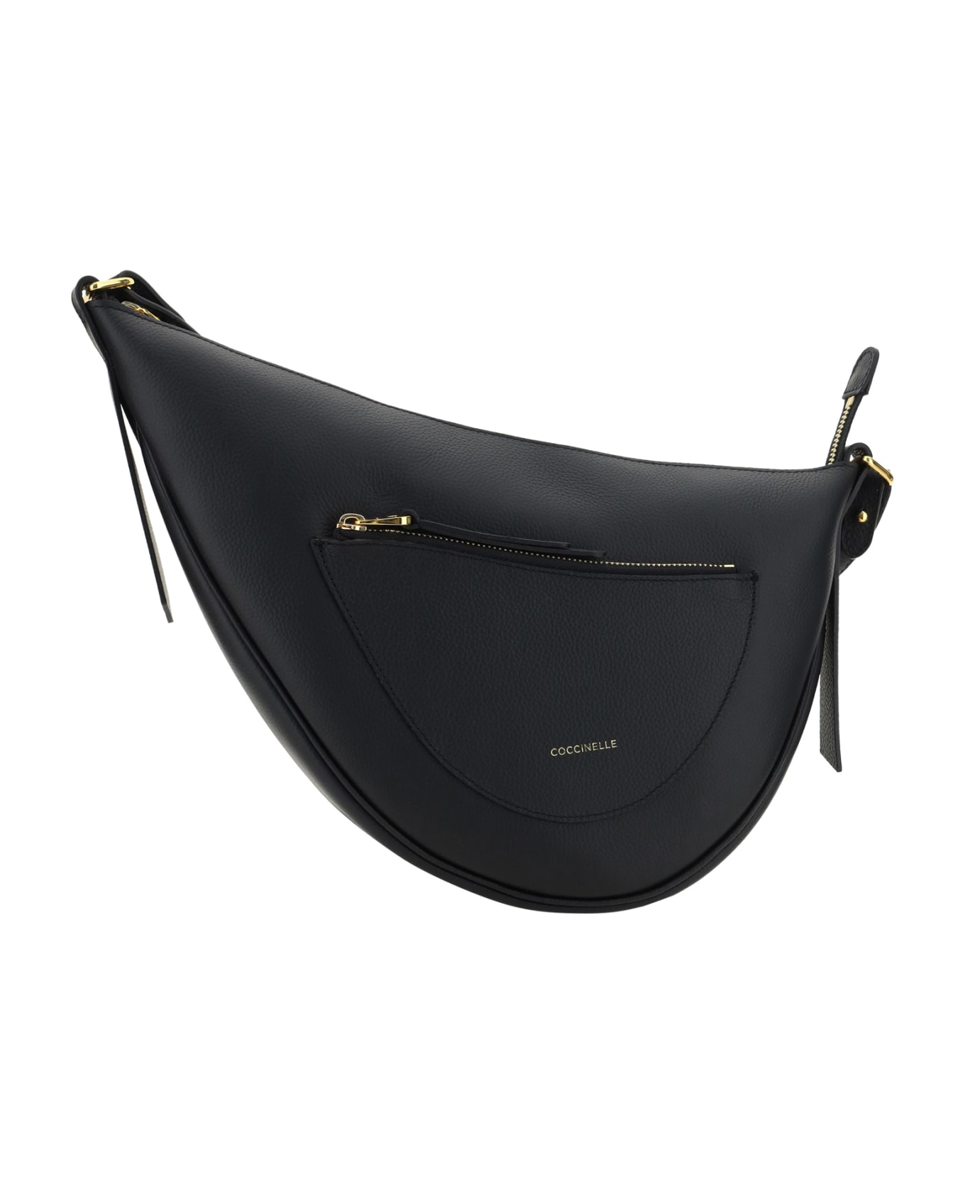 Calfskin snuggie shoulder bag by coccinelle featuring an asymmetric geometric design, an asymmetrical geometric design, a top zipper closure, an adjustable buckle shoulder strap, a slit front patch pocket with a zipper for closure, and the brand's iconic signature press-stamped on the front pocket.
