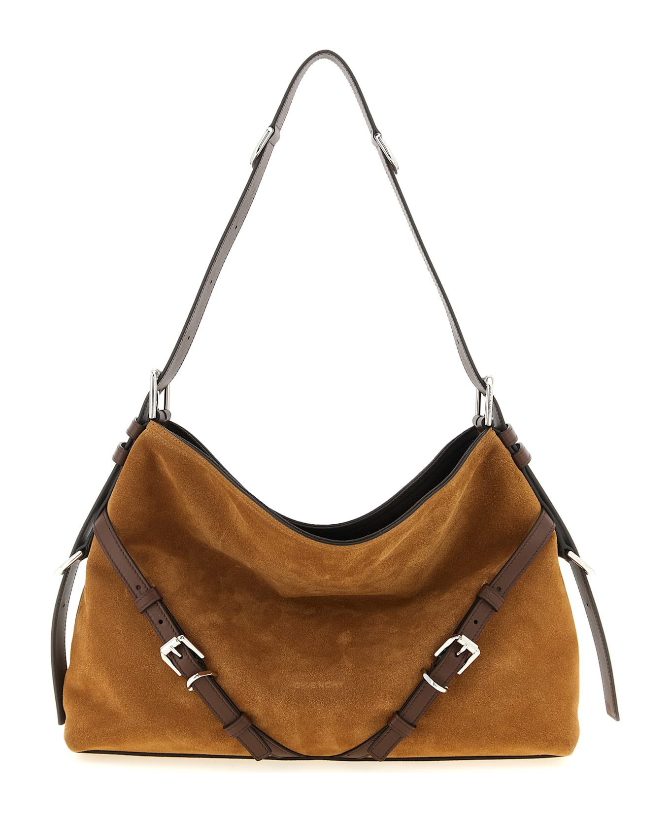 Medium suede shoulder bag with contrasting leather details, 'Voyou' line, soft V-silhouette, embossed logo and strap detail with metal buckles on the front, adjustable handle, canvas lining, an inner pocket.