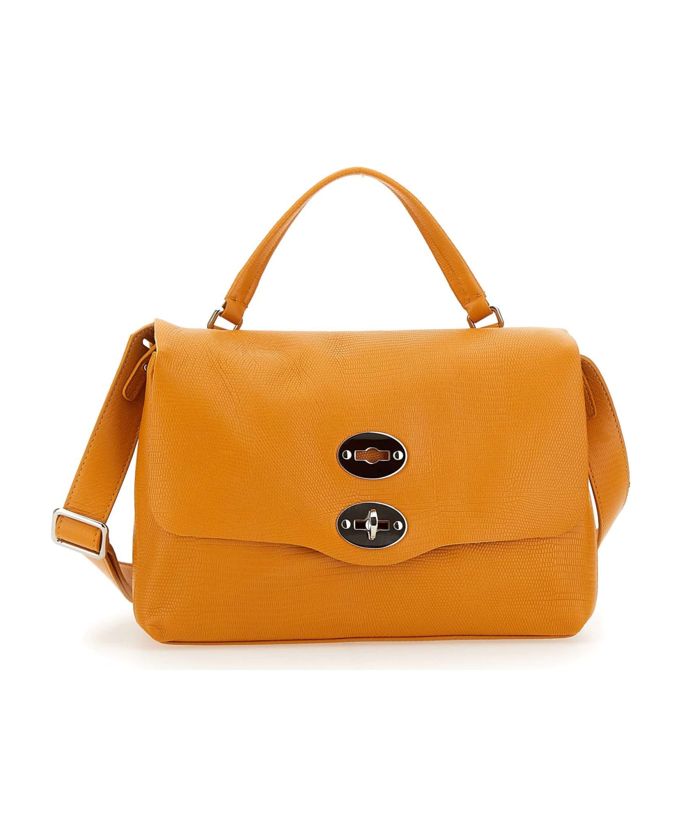Zanellato "Postina Starlight Luxethic Small" reptile-effect leather handbag, baragan orange, swivel mechanism fastening, top handle, adjustable shoulder strap, silver metallic finishes, support feet on hem, double internal compartment with zipped pocket, lining contrasting camel colour. Dimensions: depth 13cm, width 30cm, height 19cm, shoulder strap 60cm. Made in Italy.